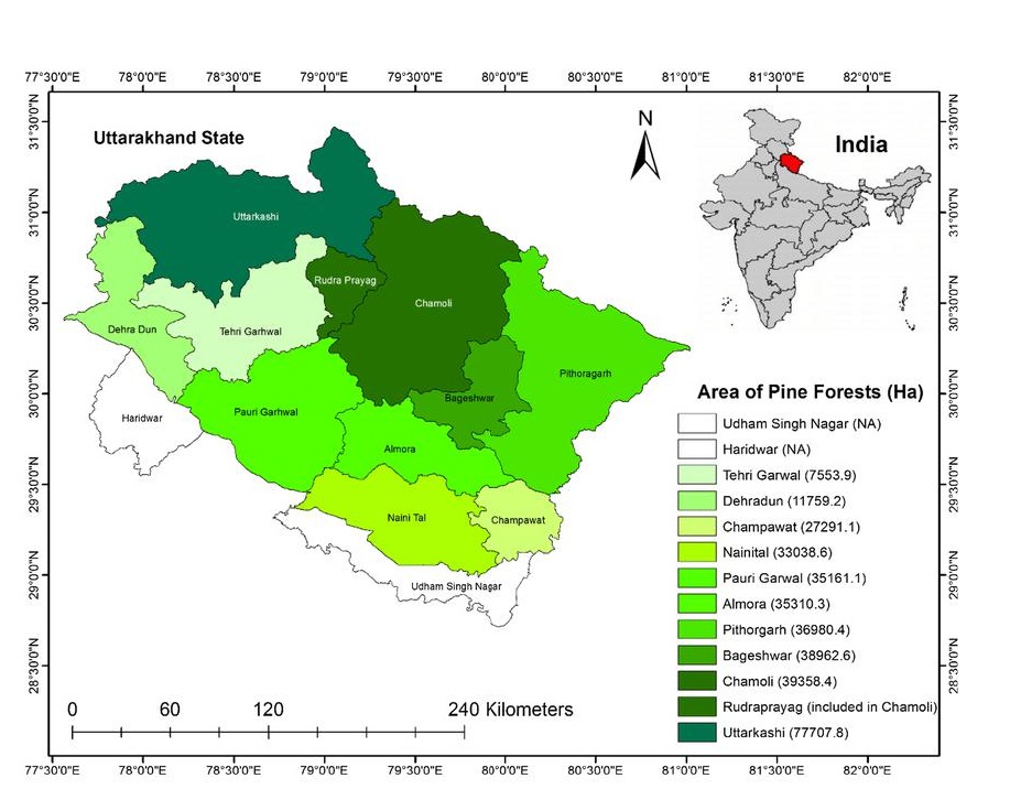 उत्तराखण्ड के कुल क्षेत्रफल का 71.05% वन क्षेत्र (37999.60 square km) है जिसमें से 27.06% प्रतिशत चीड़ का वन क्षेत्र है। जनपद पौड़ी में चीड़ का कुल वन क्षेत्रफल लगभग 35161.1 है. है। चीड़ उत्तराखण्ड के समस्त जनपदों के वन क्षेत्र में पाया जाता है व इसका क्षेत्रफल लगातर बढ़ता जा रहा है। चीड़ उत्तराखण्ड में वनाग्नि के लिए एक महत्वूपर्ण कारक भी है तथा अधिकतर वनाग्नि की घटनायें चीड़ के जंगल से प्रारंभ होकर अन्य मिश्रित वनों को भी अपने आगोश में ले लेती है।
