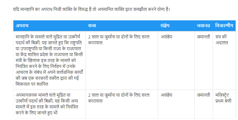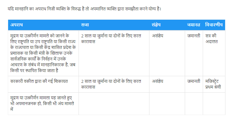 2. किसी अन्य मामले में मानहानिकारक विषय मुद्रित या उत्कीर्ण करना । सजा – दो वर्ष सादा कारावास या आर्थिक दण्ड या दोनों।यह एक जमानती, गैर-संज्ञेय अपराध है और प्रथम श्रेणी के न्यायधीश द्वारा विचारणीय है। यदि मानहानि का अपराध निजी व्यक्ति के विरुद्ध है तो अपमानित व्यक्ति द्वारा समझौता करने योग्य है।