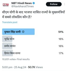 देश के प्रतिष्ठित मीडिया समूह नव भारत टाइम्स ने अपने ऑनलाइन प्लेटफार्म पर सीएम योगी के बाद भाजपा शासित राज्यों के मुख्यमंत्रियों में सबसे लोकप्रिय मुख्यमंत्री को लेकर पोल कराया। इस पर मुख्यमंत्री पुष्कर सिंह धामी के नाम पर 51.1 फीसद जनता ने पोल कर सबसे लोकप्रिय मुख्यमंत्री पर मुहर लगाई है। जबकि पोल के दौरान जनता ने कमेंट के माध्यम से भी मुख्यमंत्री धामी के फैसलों और कामकाज की खुलकर तारीफ की है।