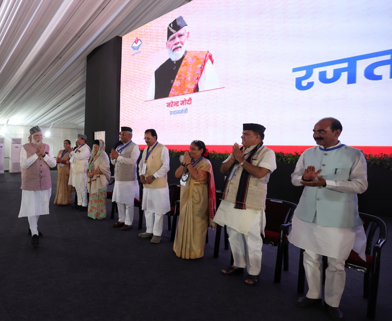 मुख्यमंत्री पुष्कर सिंह धामी ने राज्य स्थापना दिवस रजत जयंती पर्व की बधाई देने के साथ ही प्रधानमंत्री नरेंद्र मोदी का स्वागत करते हुए कहा कि ये हम सभी उत्तराखंडवासियों का सौभाग्य है कि इस ऐतिहासिक अवसर पर हमें यशस्वी प्रधानमंत्री जी का सान्निध्य प्राप्त हो रहा है।