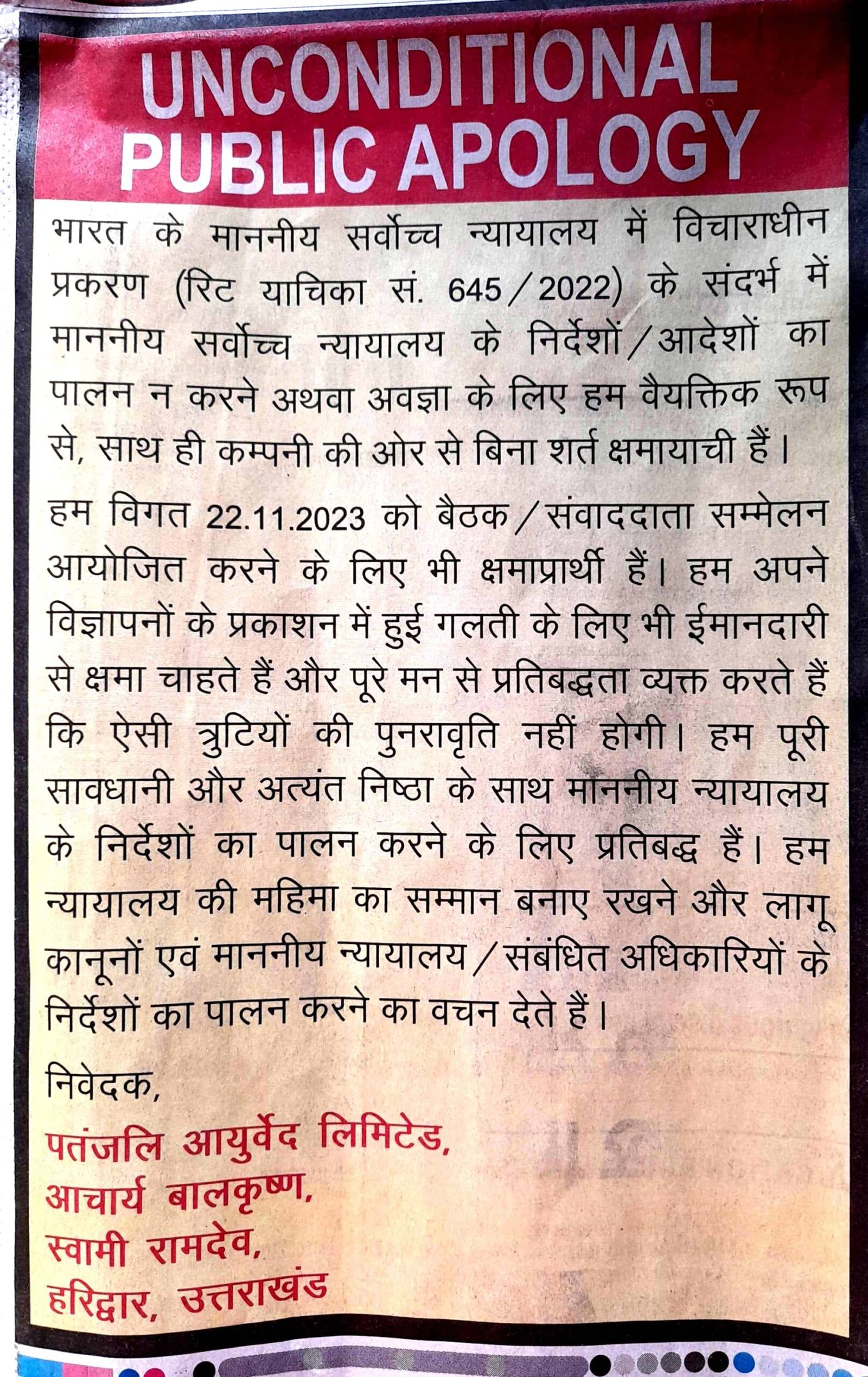 सुप्रीम कोर्ट के आदेश के बाद बाबा रामदेव एवं आचार्य बालकृष्ण ने छपवाया माफीनामा