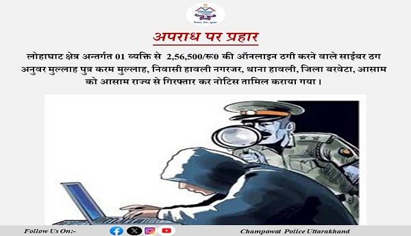 चम्पावत : लोहाघाट क्षेत्र अंतर्गत लोगों से ऑनलाइन ठगी करने वाले 01 ठग को आसाम  राज्य से गिरफ्तार कर, नोटिस तामील कराया गया। पुलिस अधीक्षक जनपद चम्पावत अजय गणपति के निर्देशानुसार तथा पुलिस उपाधीक्षक चम्पावत /टनकपुर के पर्यवेक्षण में जनपद चम्पावत में ऑनलाईन ठगी करने वाले अभियुक्तों के विरूद्ध कार्यवाही किये जाने हेतु निर्देशित किया गया है। उक्त के क्रम में जनपद चंपावत के थाना लोहाघाट  क्षेत्र अंतर्गत अज्ञात साइबर ठग द्वारा 01 व्यक्ति से 2,56,500/रूपये की ऑनलाइन ठगी की गई थी जिस सम्बन्ध में थाना लोहाघाट में FIR NO-64/2023, U/S-420 IPC बनाम अज्ञात पंजीकृत किया गया ।  दौराने विवेचना उक्त अभियुक्त आसाम राज्य का होना प्रकाश में आया ।