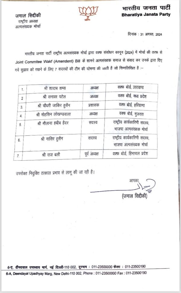 वक्फ बोर्ड बिल पर भाजपा अल्पसंख्यक मोर्चा की सात सदस्यीय समिति लेगी लोगों की राय, वक्फ बोर्ड उत्तराखंड के अध्यक्ष शादाब शम्स को बनाया गया सदस्य