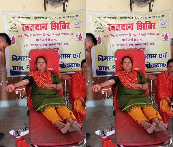 कोटद्वार। विमला कुंदन सेवाग्राम ट्रस्ट की ओर से रविवार को अंगदानी स्वर्गीय चंद्रकांता रावत एवं स्वर्गीय कुणाल रावत की स्मृति में आयोजित स्वैच्छिक रक्तदान शिविर में 69 रक्तदानियों ने रक्तदान किया। श्री महंत इंद्रेश हॉस्पिटल देहरादून के सहयोग से मोटाढांग स्थित बाल भारती सीनियर सेकेंडरी स्कूल में आयोजित स्वैच्छिक रक्तदान शिविर में 104 रक्तदानी रक्तदान करने पहुँचे जिसमें 25 लोग रक्तदान करने में असफल रहे और 69 लोगों ने सफलता पूर्वक रक्तदान किया। कार्यक्रम के दौरान आधारशिला रक्तदान फाउंडेशन ने अंगदानी परिवार के मुख्य गिरिराज सिंह रावत एवं उनके परिवार को अंगवस्त्र उड़ाकर तथा स्मृति चिन्ह भेंट कर सम्मानित किया। वहीं रक्तदान शिविर के दौरान मोहन फाउंडेशन ने रक्तदानियों को अंगदान के प्रति जागरूक किया जिसमें 30 रक्तदानियों ने अंगदान के लिए संकल्पित होकर संकल्प पत्र भरा। मोहन फाउंडेशन के प्रोजेक्ट लीडर संचित अरोड़ा ने जानकारी दी कि अंगदान के लिए संकल्प पत्र भरने वाले लोगो को बाद में कार्ड निर्गत किया जायेगा । कार्यक्रम में मृत्यु उपरांत नेत्रदान करने वाले स्वर्गीय मदन मोहन सुंद्रियाल के पुत्र विजय सुंद्रियाल व स्वर्गीय अशोक‌ भाटिया के भाई संजय भाटिया को सम्मानित किया गया ।