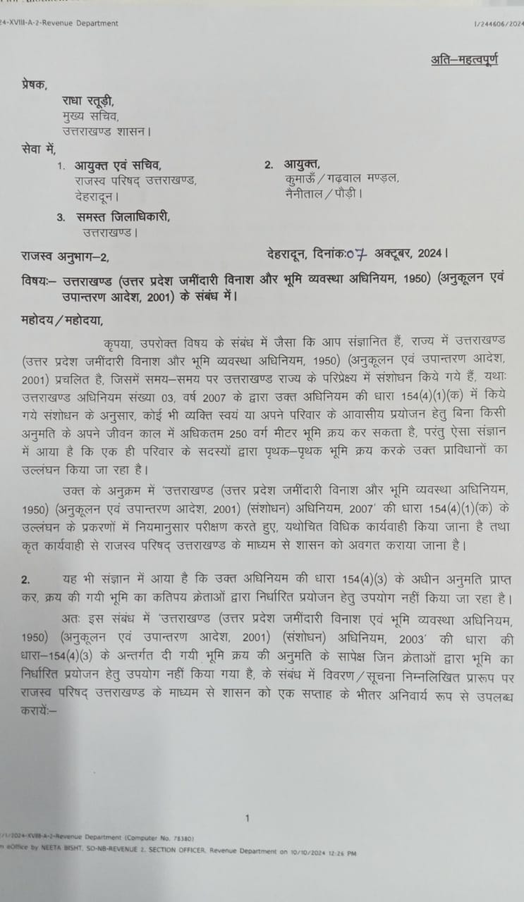 देहरादून : मुख्य सचिव राधा रतूड़ी ने सभी जिलों से 250 वर्ग मीटर से अधिक भूमि खरीद का ब्योरा तलब किया है। साथ ही 12.50 एकड़ से अधिक भूमि के उपयोग का भी ब्योरा मांगा है। मुख्य सचिव ने सात दिन के भीतर इसकी रिपोर्ट मांगी है। कि बता दें कि सीएम ने चार जिलों के बारे में रिपोर्ट मांगी थी। लेकिन अब जांच का दायरा बढ़ा दिया गया है। नियमों के विपरीत भूमि होने पर सारी भूमि सरकार में निहित होगी।