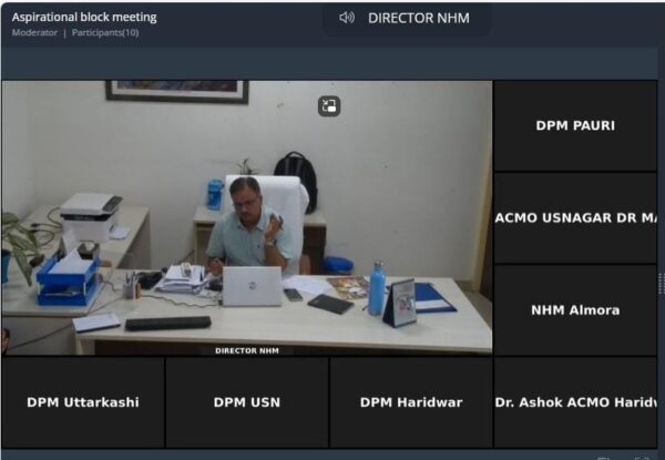 देहरादून : उत्तराखंड में आकांक्षी ब्लॉक कार्यक्रम की समीक्षा बैठक का आयोजन आज वर्चुअल माध्यम से राष्ट्रीय स्वास्थ्य मिशन, उत्तराखंड के निदेशक डॉ. मनु जैन की अध्यक्षता में किया गया। इस बैठक में स्वास्थ्य और परिवार कल्याण मंत्रालय, भारत सरकार द्वारा चिन्हित छह आकांक्षी ब्लॉकों की प्रगति की समीक्षा की गई। इनमें अल्मोड़ा जिले का स्यालदे, उत्तरकाशी का मोरी, हरिद्वार का बहादराबाद, ऊधम सिंह नगर का गदरपुर, पौडी गढ़वाल का दुगड्डा और बागेश्वर का कपकोट ब्लॉक शामिल हैं। उक्त बैठक में राज्य के सहायक निदेशक मातृ एवं बाल स्वास्थ्य, सीनियर कन्सलटेंट मातृ स्वास्थ्य के साथ जनपदों के अतिरिक्त मुख्य चिकित्सा अधिकारी, जिला कार्यक्रम प्रबंधक एवं जिला कार्यक्रम अधिकारी मातृ एवं बाल स्वास्थ्य द्वारा प्रतिभाग किया गया।