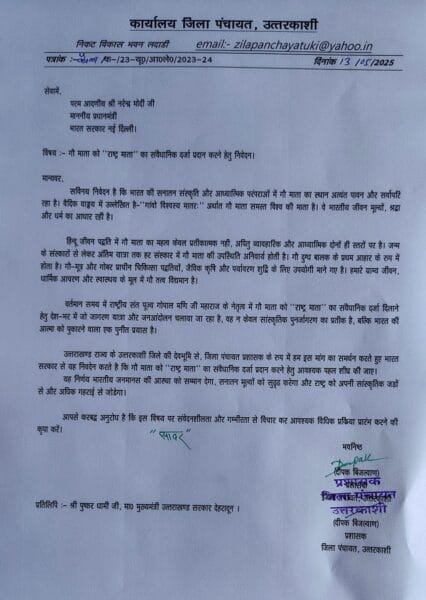 उत्तरकाशी: जिला पंचायत उत्तरकाशी के प्रशासक दीपक बिजल्वाण ने प्रधानमंत्री नरेंद्र मोदी को पत्र लिखकर गौ माता को “राष्ट्र माता” का संवैधानिक दर्जा देने की मांग की है। अपने पत्र में उन्होंने कहा कि गौ माता भारतीय सनातन संस्कृति, जीवन दर्शन और पर्यावरण संतुलन की प्रतीक हैं, और उन्हें राष्ट्र माता का दर्जा देना न केवल संस्कृति के सम्मान की दिशा में एक महत्वपूर्ण कदम होगा, बल्कि यह समाज में मूल्यों की पुनर्स्थापना भी करेगा।