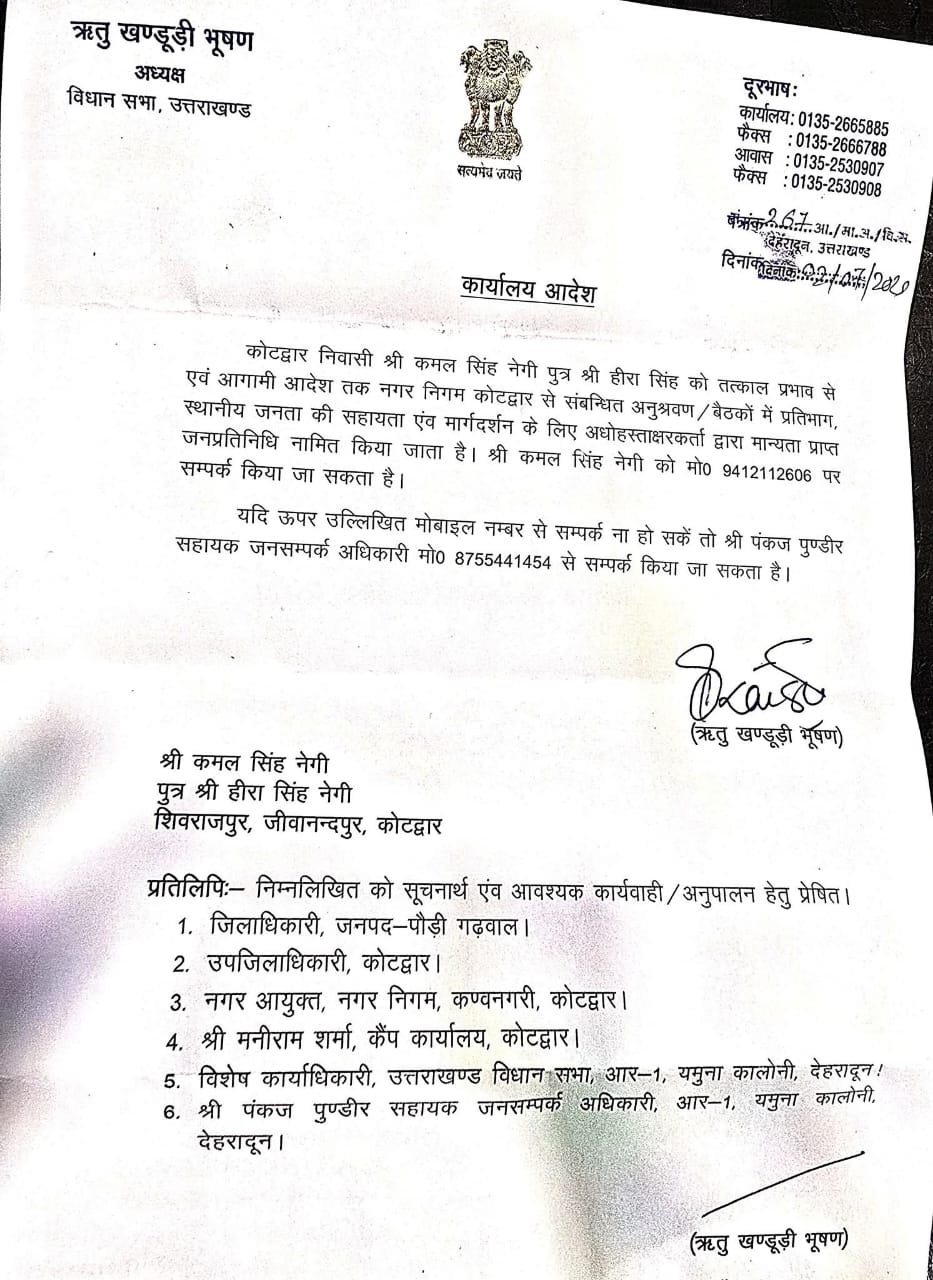 कोटद्वार : विधानसभा क्षेत्र में जनसंपर्क और जनसेवा को अधिक प्रभावी बनाने के उद्देश्य से उत्तराखंड विधानसभा की अध्यक्ष व विधायक कोटद्वार ऋतु खण्डूडी भूषण ने आज दो प्रतिनिधियों की नियुक्ति की। वार्ड संख्या 07, बेस चिकित्सालय क्षेत्र के लिए जितेन्द्र नेगी पुत्र अमर सिंह नेगी तथा वार्ड संख्या 27, नगर निगम के लिए कमल सिंह नेगी पुत्र स्वर्गीय हीरा सिंह नेगी को प्रतिनिधि नियुक्त किया गया है।