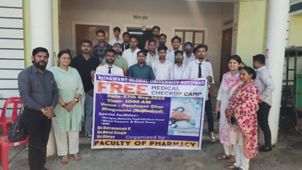 कोटद्वार : भगवंत ग्लोबल विश्वविद्यालय कोटद्वार के प्रति कुलपति प्रोफेसर डॉ. पी.एस.राणा के निर्देशानुसार फैकल्टी ऑफ फार्मेसी के प्रधानाचार्य डॉ. के.सरवानन के मार्गदर्शन में विश्वविद्यालय की फैकल्टी आफ फार्मेसी के सभी शिक्षकों व छात्र- छात्राओं के सहयोग से ग्राम पंचायत- भागूवाला (नजीबाबाद) में निःशुल्क स्वास्थ्य जांच शिविर का आयोजन किया गया जिसमें अनुभवी चिकित्सकों द्वारा डेंगू, मलेरिया, टाइफाइड, वायरल फीवर, ब्लड प्रैशर एवं अन्य स्वास्थ्य सेवाएं व दिनचर्या के बारे में मरीजों को जानकारी प्रदान की गई । शिविर में लगभग 150 मरीजोंं ने नि:शुल्क स्वास्थ्य जांच शिविर का लाभ उठाया। कार्यक्रम के दौरान फार्मेसी विभाग के समस्त अध्यापकगण विकास कुमार, रविन्द्र कुमार, पिंकी बिष्ट, रक्षंदा धुलिया,अजय कुमार, रीना व शारिक अहमद व फार्मेसी के छात्र मौजूद रहे। ग्रामवासियों द्वारा कार्यक्रम की सराहना की ।