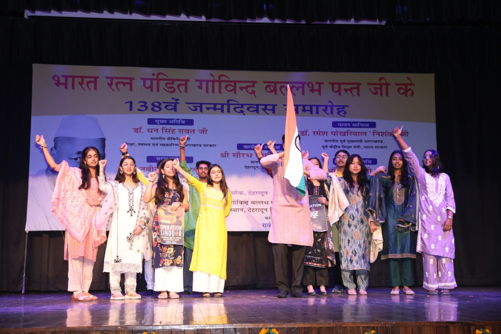 देहरादून : भारत रत्न पंडित गोविंद बल्लभ पंत जी का 138वां जन्मदिवस देहरादून के आई.आर.डी.टी. सभागार में आयोजित किया गया। इस अवसर पर शिक्षा मंत्री डॉ धन सिंह रावत, पूर्व मुख्यमंत्री डॉ रमेश पोखरियाल निशंक, कुलपति मुक्त विश्वविद्यालय प्रो नवीन चन्द्र लोहनी, उपाध्यक्ष उत्तरांचल विश्वविद्यालय अंकिता जोशी एवं कार्यक्रम संयोजक राकेश डोभाल ने संयुक्त रूप से पं. गोविन्द बल्लभ पन्त जी के चित्र के सम्मुख दीप प्रज्वलन व पुष्पांजली कर कार्यक्रम का शुभारंभ किया।
