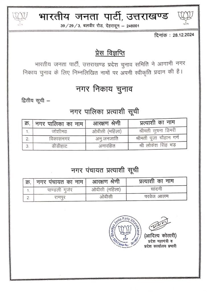 देहरादून। भाजपा ने नगर पालिका और नगर पंचायत प्रत्याशियों की दूसरी सूची जारी कर दी है। पार्टी के प्रदेश मीडिया प्रभारी मनवीर सिंह चौहान ने कहा कि हरिद्वार जिले की नगर पालिका मंगलौर और उधम सिंह नगर की महुवा खेड़ागंज व हरिद्वार जिले की नगर पंचायत सुल्तानपुर आदमपुर, लंढोरा, पिरान कलियर एवं उधम सिंह नगर की केला खेड़ा और महुवा डाबरा आदि सीटों पर सहयोगी दलों या ऐसे उम्मीदवार जो कांग्रेस सहित अन्य विपक्षी दलों को मात दे सके, उनका समर्थन किया जायेगा। इसके अलावा नरेंद्र नगर मे परसीमन पूरा ना होने के कारण चुनाव नहीं हो रहे हैं। किच्छा नगरपालिका में अंतिम आरक्षण जारी होने के बाद प्रत्याशी घोषित किया जाएगा।