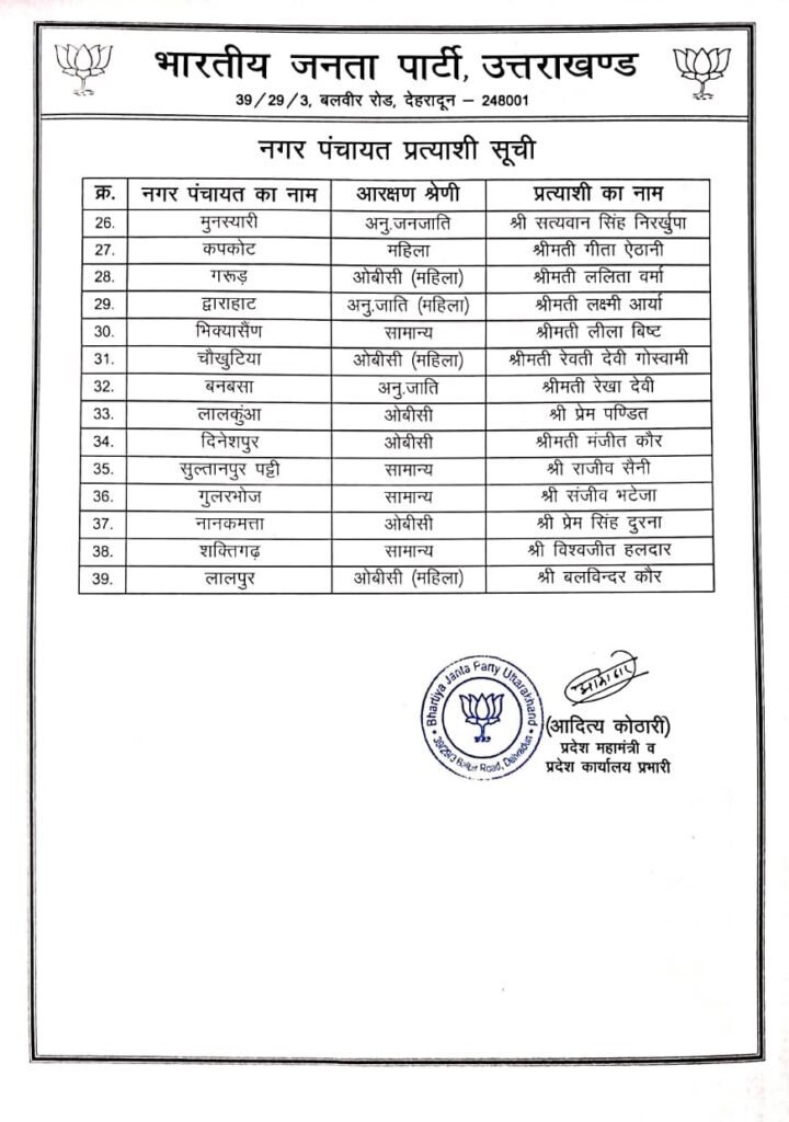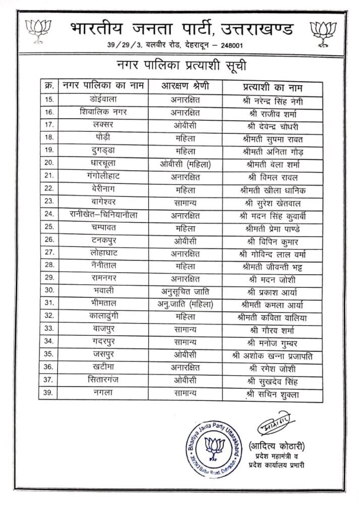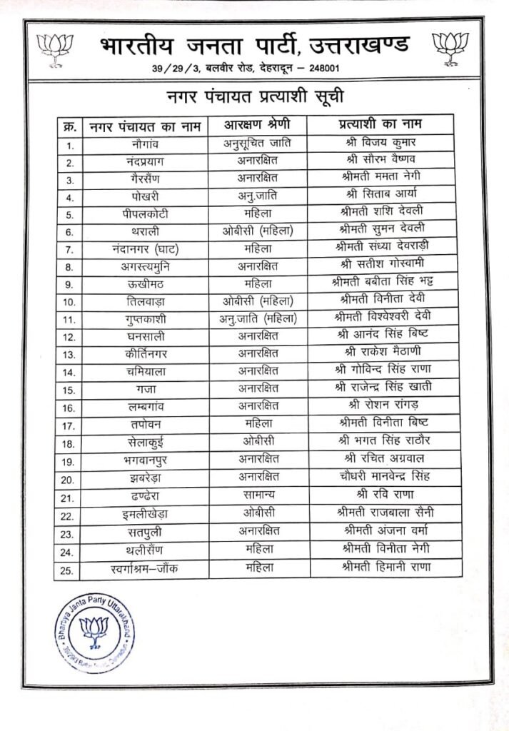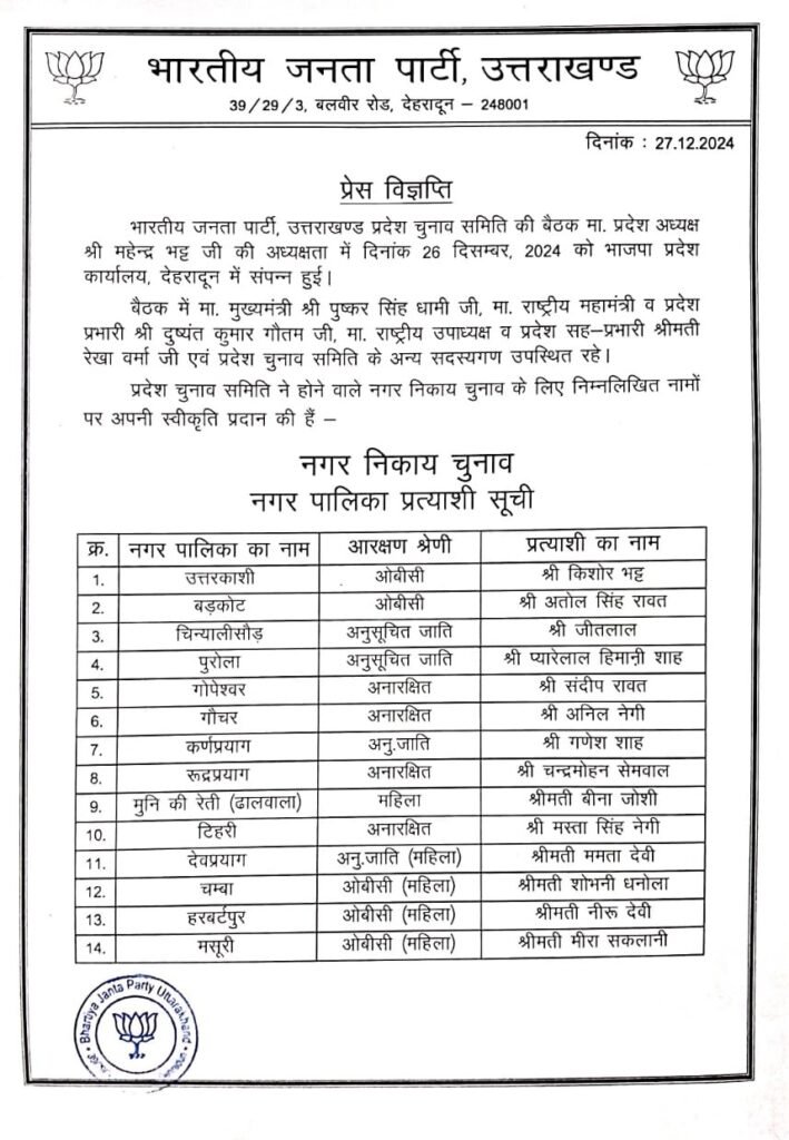 देहरादून। भाजपा ने नगर पालिका और नगर पंचायत प्रत्याशियों की सूची जारी कर दी है। पार्टी के प्रदेश मीडिया प्रभारी मनवीर सिंह चौहान ने कहा कि नगर पालिका और नगर पंचायत के बाद शीघ्र ही निगम क्षेत्र की सूची जारी की जायेगी। शनिवार को केंद्रीय नेतृत्व की संस्तुति के बाद महापौर के प्रत्याशियों की सूची जारी की जायेगी।