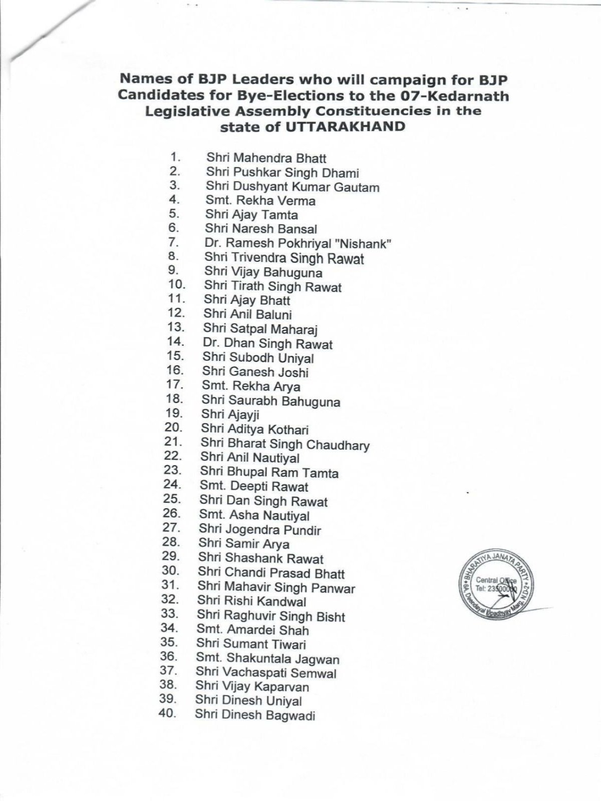केदारनाथ उपचुनाव के लिए भाजपा ने जारी की 40 स्टार प्रचारकों सूची