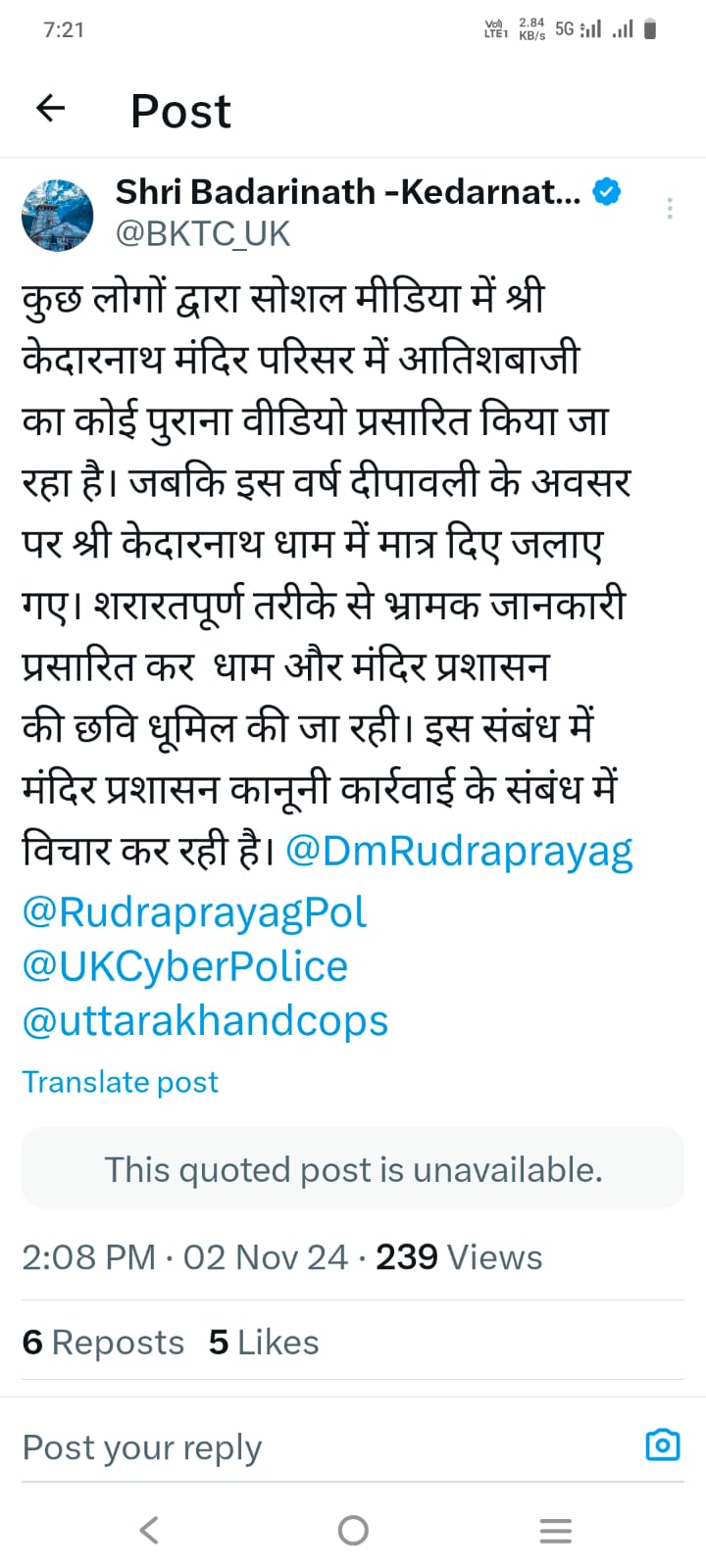 केदारनाथ धाम : श्री बदरीनाथ – केदारनाथ मंदिर समिति ने कहा है कि कुछ लोगों द्वारा सोशल मीडिया में श्री केदारनाथ मंदिर परिसर में आतिशबाजी का कोई पुराना वीडियो प्रसारित किया जा रहा है। जबकि इस वर्ष दीपावली के अवसर पर श्री केदारनाथ धाम में मात्र दिए जलाए गए। शरारतपूर्ण तरीके से भ्रामक जानकारी प्रसारित कर केदारनाथ धाम और मंदिर प्रशासन की छवि धूमिल की जा रही। इस संबंध में मंदिर समिति कानूनी कार्रवाई के संबंध में विचार कर रही है।