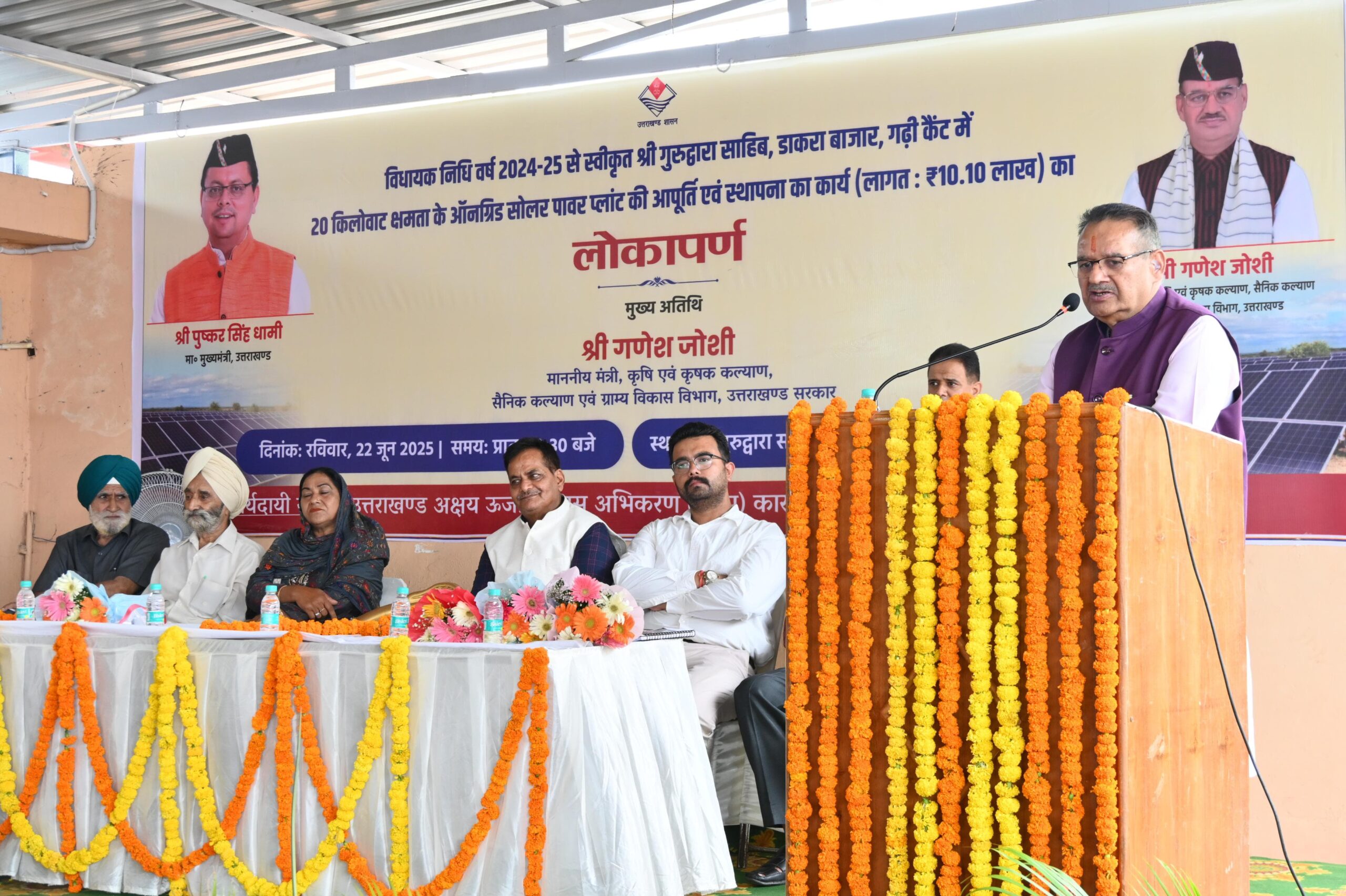 उद्घाटन के बाद अपने सम्बोधन में कैबिनेट मंत्री गणेश जोशी ने कहा कि पिछले वर्ष 14 जनवरी 2024 को मकर संक्रांति के पावन अवसर पर जब मैंने आप सबके बीच यह घोषणा की थी कि गुरुद्वारा साहिब परिसर में 20 किलोवाट क्षमता का सौर ऊर्जा संयंत्र स्थापित किया जाएगा, तब वह सिर्फ एक घोषणा नहीं थी, वह एक प्रतिबद्धता थी, एक वादा था। उन्होंने कहा कि करीब 10 लाख 10 हजार की लागत से 20 किलोवाट क्षमता वाला यह सौर पावर प्लांट अब पूरी तरह स्थापित हो चुका है। इससे प्रतिदिन 100 यूनिट और महीने में लगभग 3000 यूनिट बिजली का उत्पादन होगा। अब गुरुद्वारा साहिब बिजली के क्षेत्र में पूरी तरह आत्मनिर्भर हो गया है। अपनी बिजली खुद बनाएगा, और अपनी बनाई बिजली खुद उपयोग करेगा।