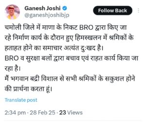 देहरादून: कैबिनेट मंत्री गणेश जोशी ने जनपद चमोली में माणा गांव के निकट बीआरओ द्वारा संचालित निर्माण कार्य के दौरान हिमस्खलन की वजह से दबे मजदूरों की भगवान बदरी विशाल से सुरक्षा और कुशलता की प्रार्थना की है। उन्होंने कहा कि हिमस्खलन की वजह से मजदूरों के दबने का दुःखद समाचार मिला है। ईश्वर से प्रार्थना है कि सभी श्रमिक सुरक्षित रहें। मंत्री ने कहा कि ITBP, BRO और अन्य बचाव दलों द्वारा राहत एवं बचाव कार्य किया जा रहा है। मंत्री गणेश जोशी ने कहा कि घटना की सूचना मिलते ही ITBP, BRO और अन्य बचाव दल मौके पर पहुंच गए हैं और राहत एवं बचाव कार्य में जुट गए हैं। उन्होंने कहा कि मुख्यमंत्री खुद घटना पर नजर बनाए हुए हैं और मजदूरों को सुरक्षित निकालने के लिए हरसंभव प्रयास किए जा रहे हैं।