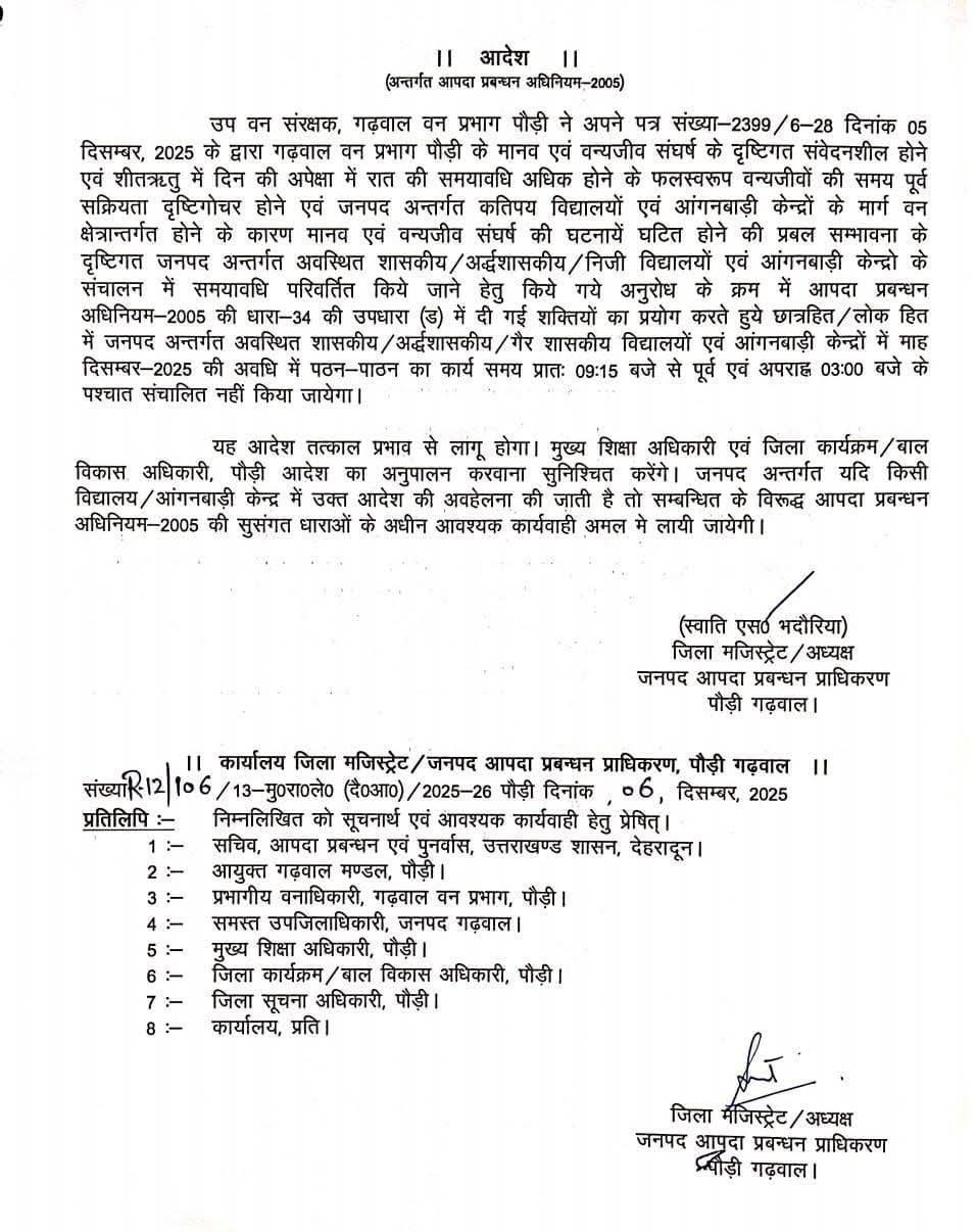 पौड़ी: जिला प्रशासन ने मानव-वन्यजीव संघर्ष की बढ़ती घटनाओं और सर्दियों में जल्दी अंधेरा होने के खतरे को देखते हुए बड़ा फैसला लिया है। जिलाधिकारी स्वाति एस. भदौरिया ने पूरे जनपद पौड़ी गढ़वाल में दिसंबर माह के लिए सभी शासकीय, अर्द्धशासकीय, निजी स्कूलों और आंगनबाड़ी केंद्रों के समय में अस्थायी बदलाव के आदेश जारी किए हैं।