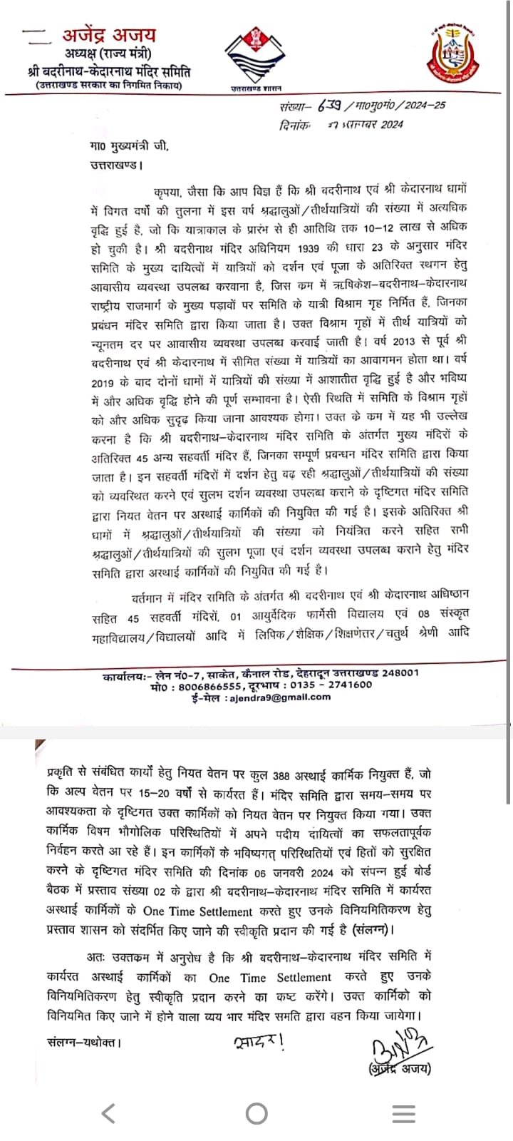 कहा कि वर्तमान में मंदिर समिति के अंतर्गत श्री बदरीनाथ एवं श्री केदारनाथ अधिष्ठान सहित 45 सहवर्ती मंदिरों, 01 आयुर्वेदिक फार्मेसी विद्यालय एवं 08 संस्कृत महाविद्यालय/विद्यालयों आदि में लिपिक/शैक्षिक/शिक्षणेत्तर / चतुर्थ श्रेणी-प्रकृति से संबंधित कार्यों हेतु नियत वेतन पर कुल 388 अस्थाई कार्मिक नियुक्त हैं, जो कि अल्प वेतन पर 15-20 वर्षों से कार्यरत हैं। मंदिर समिति द्वारा समय-समय पर आवश्यकता के दृष्टिगत उक्त कार्मिकों को नियत वेतन पर नियुक्त किया गया। उक्त कार्मिक विषम भौगोलिक परिस्थितियों में अपने पदीय दायित्वों का सफलतापूर्वक निर्वहन करते आ रहे हैं।