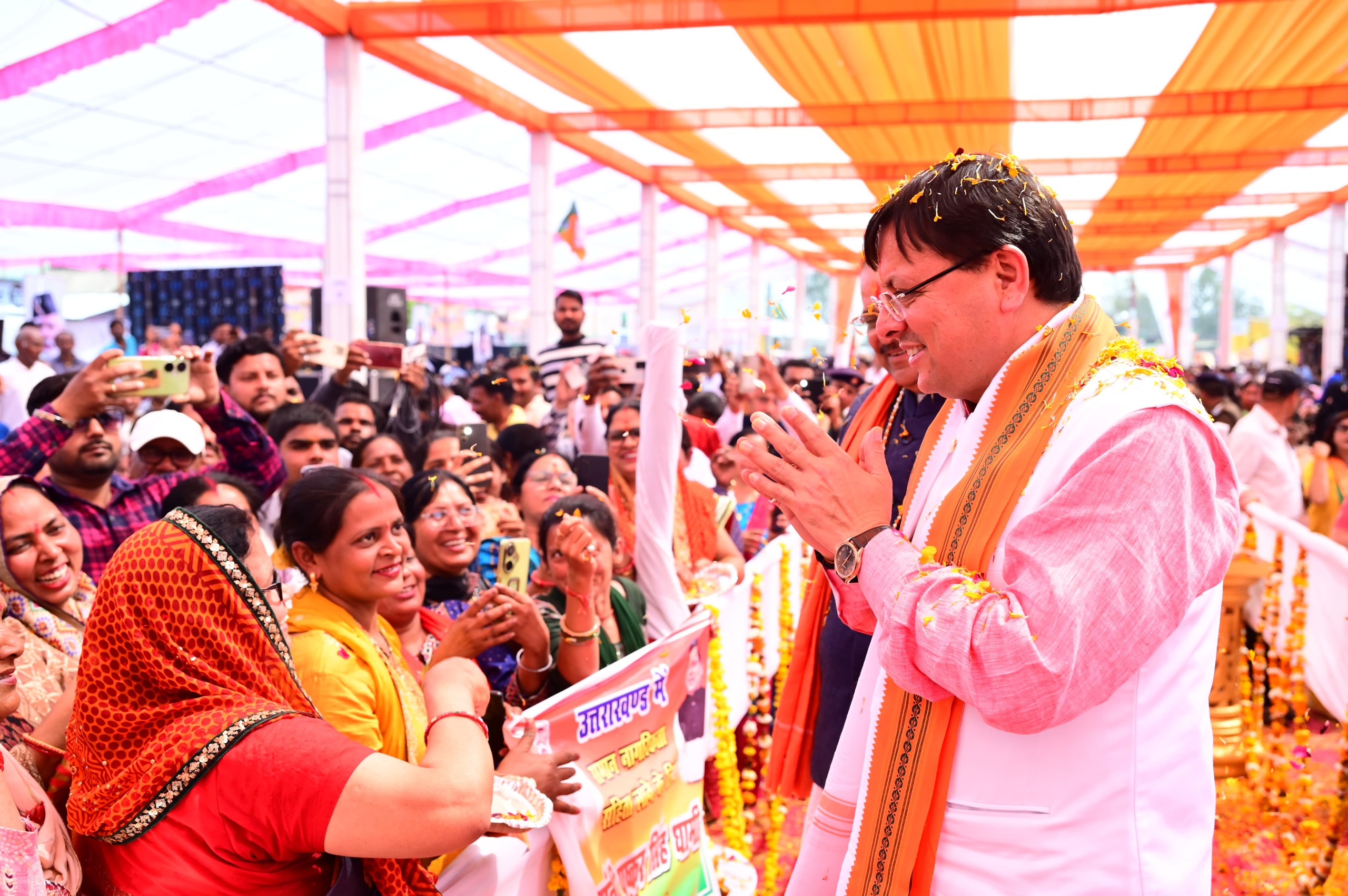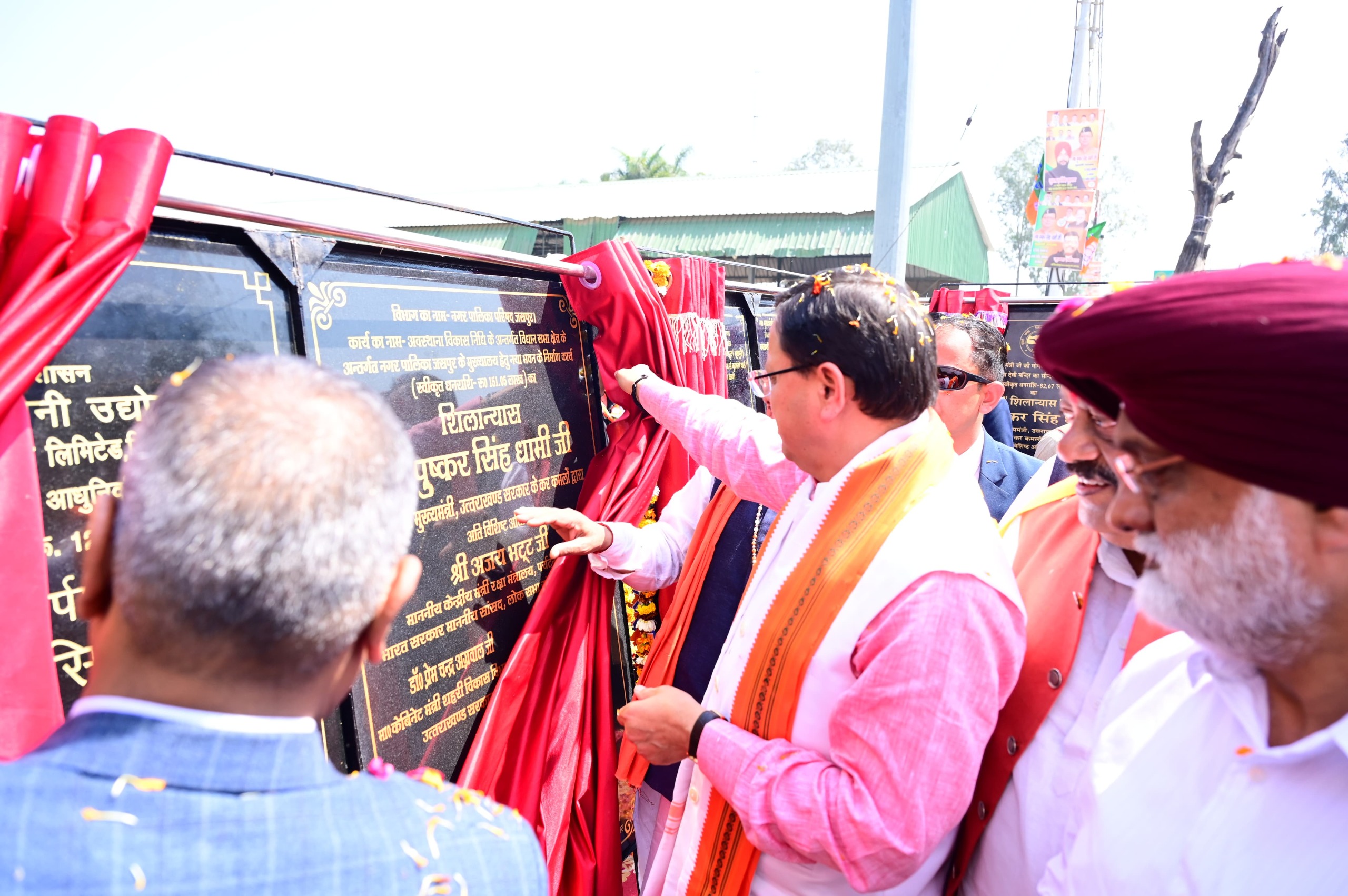 जसपुर : मुख्यमंत्री पुष्कर सिंह धामी शुक्रवार को कृषि उत्पादन मण्डी समिति में आयोजित लाभार्थी सम्मान समारोह में शामिल हुए। कार्यक्रम में मुख्यमंत्री का गीत, नृत्य, पुष्प वर्षा से जोरदार स्वागत किया गया। इस दौरान मुख्यमंत्री ने आम जन पर पुष्प वर्षा करते हुए जनसैलाब का अभिवादन स्वीकार किया। मुख्यमंत्री ने रू. 28.20 करोड़ की 7 विकास योजनाओं का शिलान्यास एवं लोकार्पण किया जिसमें 1.51 करोड़ रुपए की लागत से नगर पालिका परिषद, जसपुर के मुख्यालय के नए भवन का निर्माण कार्य, 1.41 करोड़ की लागत से विधानसभा क्षेत्र खटीमा के अंतर्गत बनखण्डी मन्दिर, चकरपुर के सौंदर्यीकरण का कार्य, 10.00 करोड़ रुपए की लागत से नादेही चीनी मिल के बॉयलरों का अपग्रेडेशन का कार्य, 0.8267 करोड़ रुपए की लागत से जसपुर के अंतर्गत ग्राम हलदुवासाहू में हिडिम्बा देवी मंदिर का सौंदर्यीकरण का कार्य, 77 लाख रुपए की लागत से जसपुर में एनएच 74 (पुराना) के किमी 131 से जसपुर धामपुर मार्ग के किमी 1 को जोड़ने वाले क्षतिग्रस्त मार्ग का पुनः निर्माण एवं सुधारीकरण का कार्य एवं 12 करोड़ किच्छा चीनी मिल के लघु आधुनिकीकरण, 1.69 करोड़ की लागत से जल जीवन मिशन के अंतर्गत पेयजल निर्माण कार्य का लोकार्पण का कार्य शामिल है।