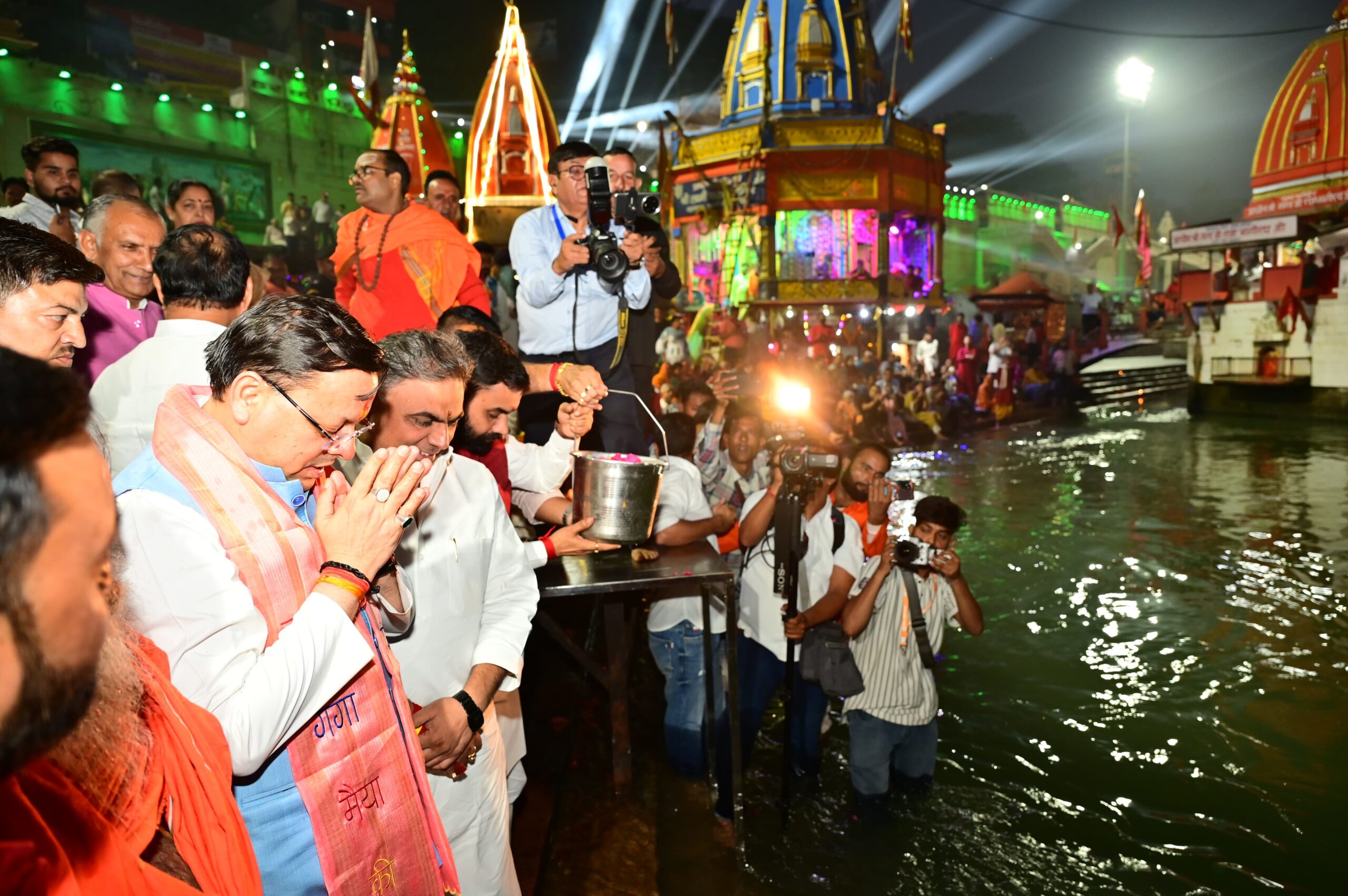 हरिद्वार : मुख्यमंत्री पुष्कर सिंह धामी ने सोमवार को हर की पैड़ी, हरिद्वार में आयोजित गंगा दीप महोत्सव कार्यक्रम में प्रतिभाग करते हुए मां गंगा की पूजा अर्चना एंव गंगा आरती में सम्मलित होकर प्रदेश की सुख समृद्धि एवं तरक्की की कामना की। इस दौरान हर की पैड़ी स्थित पुलिस चौकी का लोकार्पण भी मुख्यमंत्री द्वारा किया गया। मुख्यमंत्री ने हर की पैड़ी में राज्य की परंपरा आध्यात्मिकता और नैसर्गिकता, सनातन संस्कृति, श्री बद्रीनाथ धाम, श्री केदारनाथ धाम , कुंभ कलश, भगवान शिव, मां गंगा पर आयोजित हुए ड्रोन शो का भी अवलोकन किया। मुख्यमंत्री ने अल्मोड़ा बस हादसे में हताहत हुए लोगों की याद एंव राज्य स्थापना दिवस की वर्षगांठ में दीप प्रज्वलित किया। मुख्यमंत्री की उपस्थिति में हरिद्वार के 50 घाटों में लाखों की संख्या में दीप प्रज्वलित किए गए।