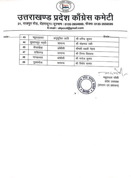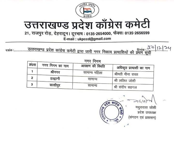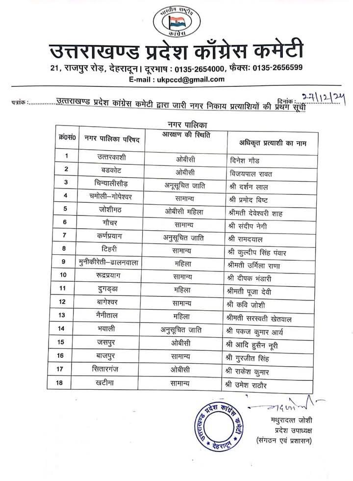 नगर निगम श्रीनगर से मीना रावत, नगर निगम काशीपुर से संदीप सहगल, हल्द्वानी से ललित जोशी को प्रत्याशी बनाया गया है। नगर पालिका बागेश्वर में कवि जोशी, खटीमा उमेश राठौर, बाजपुर गुरजीत सिंह गित्ते, सितारंगंज राजेश कुमार, बागेश्वर कवित जोशी, दुगडडा पूजा देवी, टिहरी कुल्दीप पंवार, कीर्तिनगर रामलाल नौटियाल, ढालवाला उर्मिला राणा, दुगड्डा धना बिष्ट, जोशीमठ देवेश्वरी शाह, गोपेश्वर प्रमोद बिष्ट, कर्णप्रयाग रामदयाल, गोचर संदीप नेगी, थराली सुनीता रावत, उत्तरकाशी दिनेश गौड़, चिन्यालीसौड दर्शन लाल, बड़कोट विजयपाल रावत, नैनीलताल सरस्वती खेतवाल, भवाली पंकज कुमार आर्य, रूद्रप्रयाग दीपक भंडारी, नगर पंचायत नानकमत्ता मनोज कुमार, शक्ति फार्म राखी विश्वास, गुलर भेाज किशोर सामंत, सुल्तानपुर पट्टी मोहम्मद रफी, बेरीनाग हेमा पंत, मुनस्यारी मनोहर टोलिया, स्वागस्श्रम जोंक बिन्दिया अग्रवाल, गरूड भावना वर्मा, कपकोट धना बिष्ट, सतपुली जितेन्द्र चोहान, थलीसैण वीरा देवी, घनसाली शंकरपाल सिंह सजवाण, चमियाला ममता पंवार, पीपलकोटी जयंती राणा, पोखरी समुन्दरा देवी, घाट मीना रौतेला, नन्द प्रयाग पृथ्वी सिंह रौतेला, पुरेाला बिहारी लाल शाह, नौगाव विपिन कुमार, भीमताल सीमा टम्टा, कालाढूंगी भावना सती, तिलवाडा सीमा देवी, गुप्तकाशी बीना देवी, अगस्त्यमनि राजेन्द्र गोस्वामी, उखीमठ रीता पुष्पवाण को पार्टी का अधिकृत प्रत्याशी बनाया गया है।