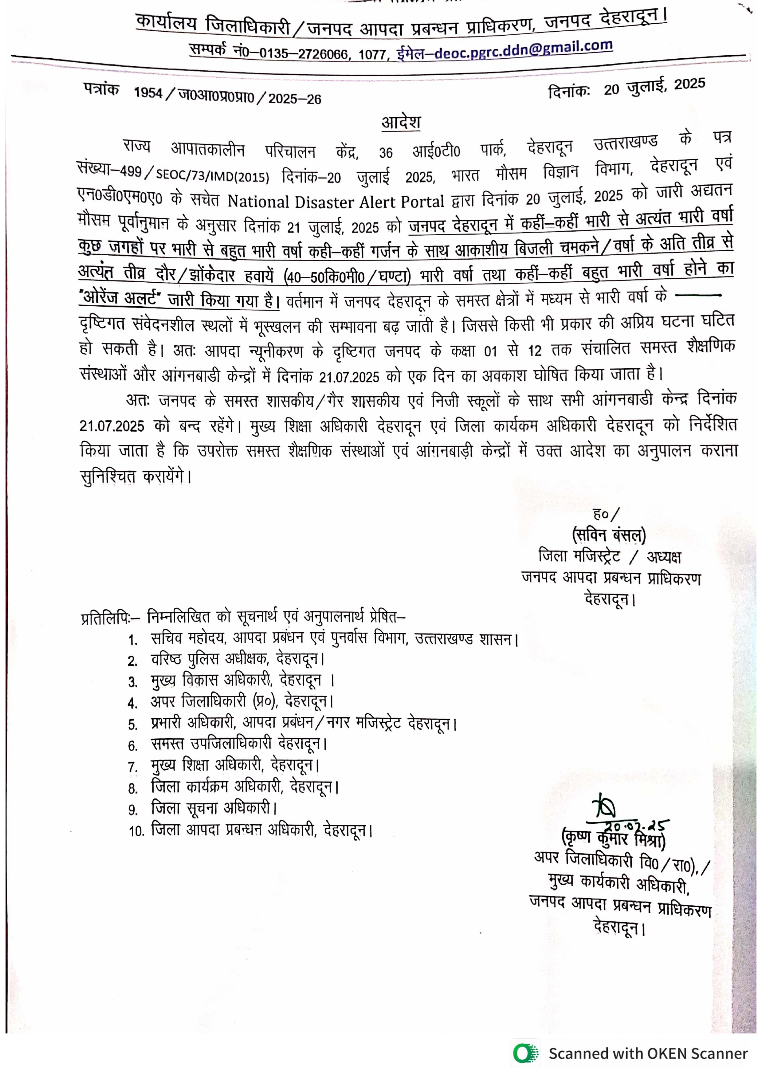 देहरादून : जनपद देहरादून में 21 जुलाई को भारी से बहुत भारी वर्षा के मद्देनज़र जिला प्रशासन ने भारी बारिश का ‘ऑरेंज अलर्ट’ के तहत सभी शैक्षणिक संस्थानों को एक दिन के लिए बंद रखने के आदेश जारी किए हैं। आदेश में कहा गया है कि इस दिन स्कूल, कॉलेज, आंगनबाड़ी, सरकारी व निजी शिक्षण संस्थान बंद रहेंगे।