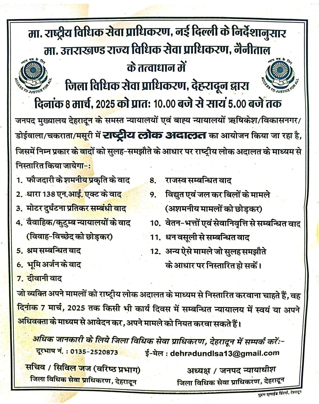 देहरादून : सचिव /सिविल जज (वरिष्ठ प्रभाग) जिला विधिक सेवा प्राधिकरण देहरादून ने अवगत कराया है कि राष्ट्रीय विधिक सेवा प्राधिकरण, नई दिल्ली, उत्तराखण्ड राज्य विधिक सेवा प्राधिकरण, नैनीताल के निर्देशानुसार तथा जिला न्यायाधीश, देहरादून के दिशा-निर्देशन में  आगामी  08 मार्च 2025 को प्रातः 10 बजे से सायं 05:00 बजे तक जनपद देहरादून के समस्त न्यायालयों एवं बाह्य न्यायालयों ऋषिकेश, डोईवाला, मसूरी, विकासनगर, चकराता में राष्ट्रीय लोक अदालत का आयोजन किया जा रहा है, जिसमें फौजदारी के शमनीय वाद, मोटर दुर्घटना प्रतिकर सम्बंधित वाद, सिविल वाद, धन वसूली वाद, चैक बाउंस मामले, वैवाहिक संबंधों पर आधारित मामलें तथा अन्य कई प्रकृति के वादों का निस्तारण आपसी सुलह-समझौते के आधार पर किया जायेगा। अतः वे सभी व्यक्ति, जिनके वाद जिला देहरादून के किसी भी न्यायालय में लंबित है, वे 07 मार्च   2025 तक स्वयं या अपने अधिवक्ता के माध्यम से राष्ट्रीय लोक अदालत हेतु अपने वादों को नियत करवा सकते हैं।