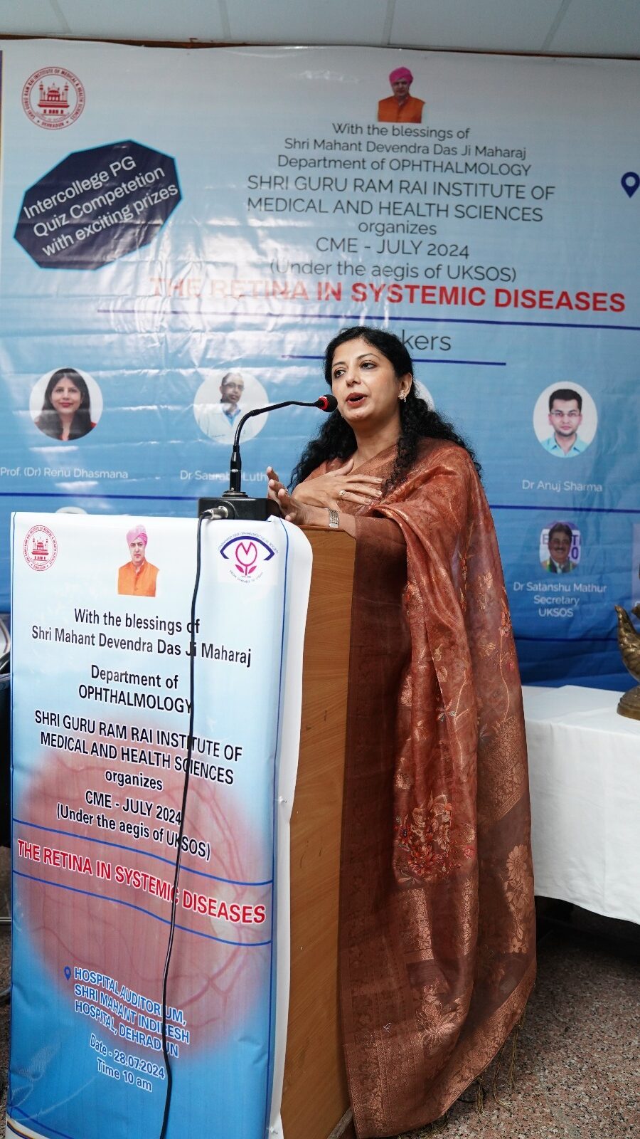इसके उपंरात सी.एम.ई. कार्यक्रम की प्रथम वक्ता विभागाध्यक्ष, नेत्र रोग विभाग, हिमालयन इंस्टीट्यूट ऑफ मेंडिकल सांइसेंज व रेटिना विशेषज्ञा डॉ. रेनू धस्माना ने डायबीटिक रेटिनोपैथी व डायबीटिक किडनी डीजीज विषय पर व्याख्यान दिया। उन्होनें मधुमेह व गुर्दे के रोगियों मे होने वाली रेटिना की बिमारियों को सही समय पर पहचानने व उनके उचित उपचार की विधियों के बारे में ज्ञान साझा किया।