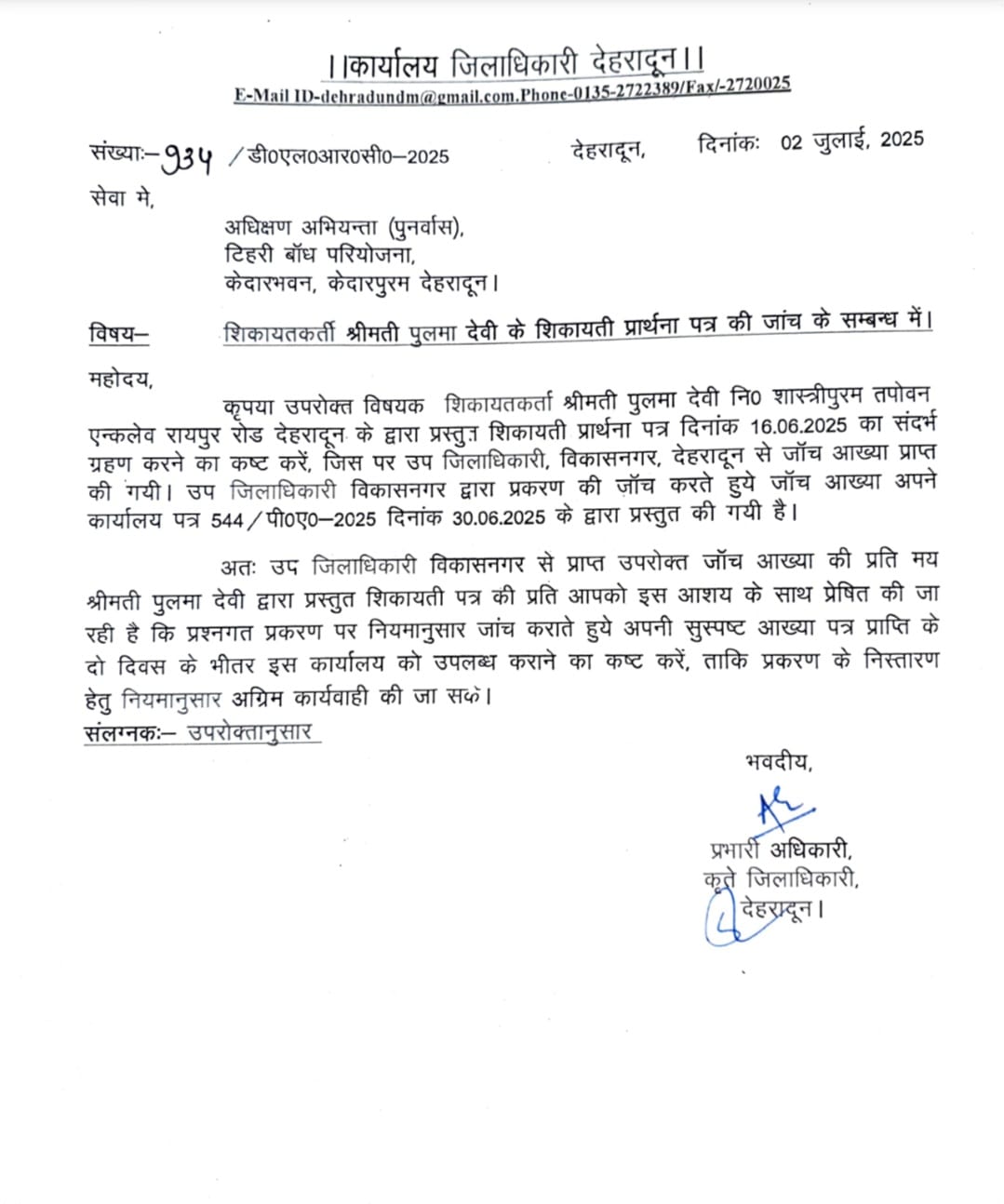 डीएम ने पकड़ा भीषण खेल, एक ही व्यक्ति ने गुमराह कर दो बार विक्रय कर दी टिहरी बांध प्रभावितों को भूमि; व्यथित, विस्थापित की मजबूरी, पीड़ा का फायदा उठा रहे पुनर्वास परियोजना अधिकारियों को डीएम ने आड़े हाथ लेते हुए। अधीक्षण अभियंता (टिहरी बांध पुर्नवास) का वाहन जब्त; विवरण सहित प्रस्तुत होने के निर्देश दिए तथा सम्बन्धित को एसआईटी जांच में संस्तुति की चेतावनी दी। डीएम की जांच में हुए खुलासे पर डीएम ने एसडीएम मुख्यालय अपूर्वा को जांच अग्रेतर क्रिमनल प्रोसेडिंग हेतु सौंप दी है। भूमि फर्जीवाडे़ की शिकार; पुलमा देवी प्रकरण पर डीएम ने प्रकरण की सभी परतें खोल दी है। अवस्थापना पुनर्वास खण्ड ऋषिकेश का कारनामा; एक व्यक्ति जिसने अपनी भूमि 2007 में विक्रय की, बिना जांच के 2019 में उसी के नाम दोबारा भूमिधरी चढावा दी। इसे डीएम ने गंभीर मानते हुए कार्यवाही के निर्देश दिए गए हैं। जून माह के द्वितीय जनता दर्शन में उठा था मामला। जब तक पुलमा देवी को न्याय नही मिलेगा, तब तक प्रशासन छोड़ने वाला नही है। प्रशासन ने इस प्रकरण पर सख्त एक्शन का मन बना लिया है।