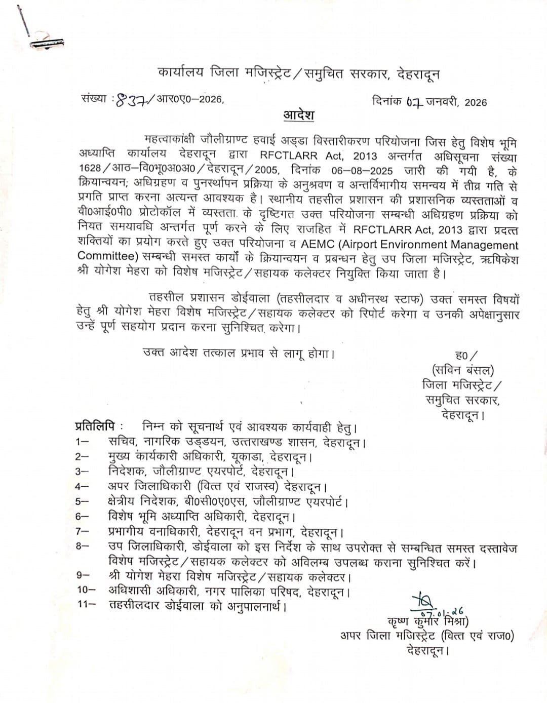 डीएम यह नियुक्ति आरएफसीटीएलएआरआर एक्ट, 2013 (भूमि अधिग्रहण, पुनर्वासन एवं पुनर्स्थापन में उचित प्रतिकर और पारदर्शिता का अधिकार अधिनियम) के अंतर्गत जौलीग्रांट एयरपोर्ट विस्तार परियोजना से जुड़ी समस्त कार्यवाहियों के प्रभावी, पारदर्शी एवं समयबद्ध क्रियान्वयन के लिए की गई है।