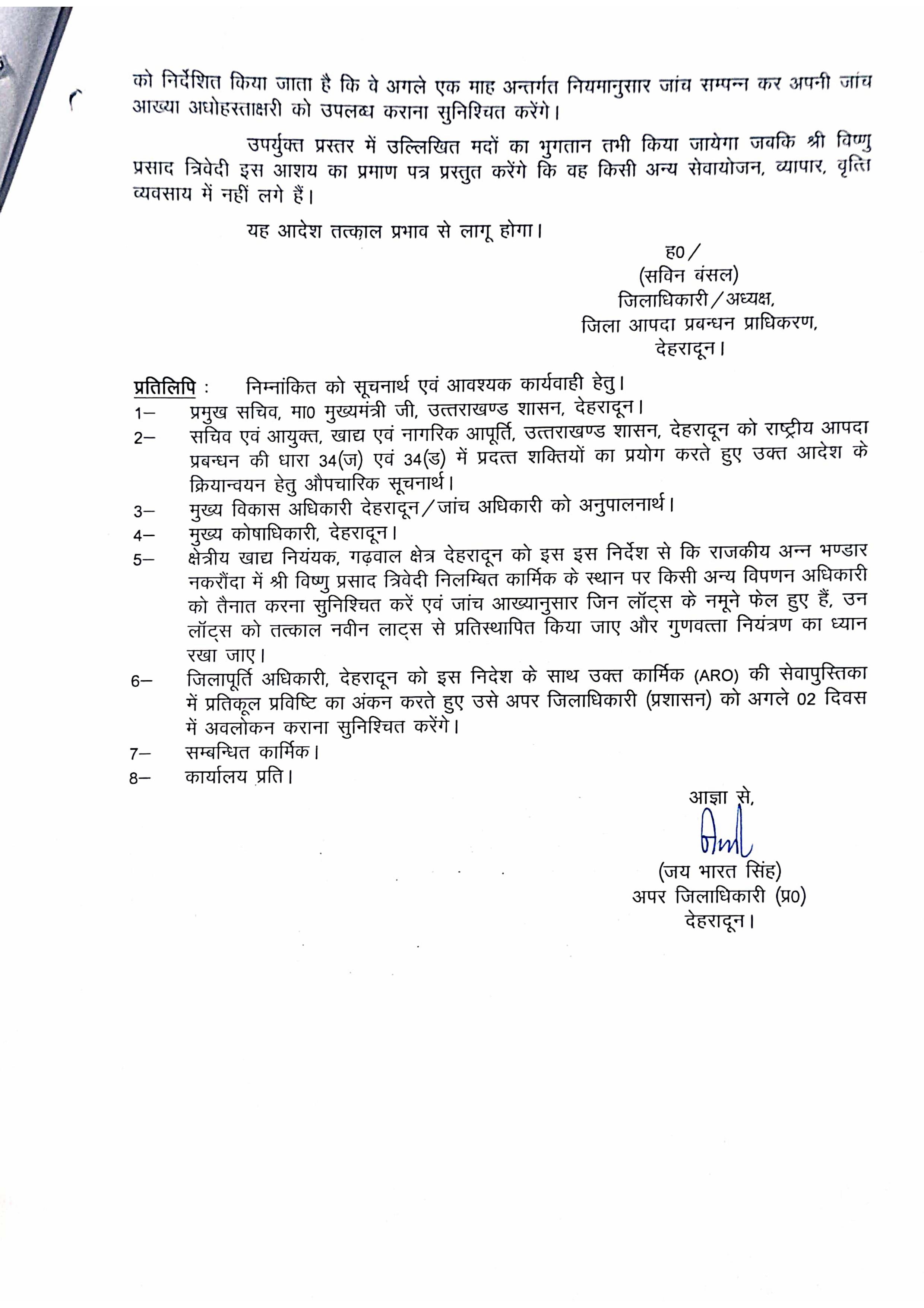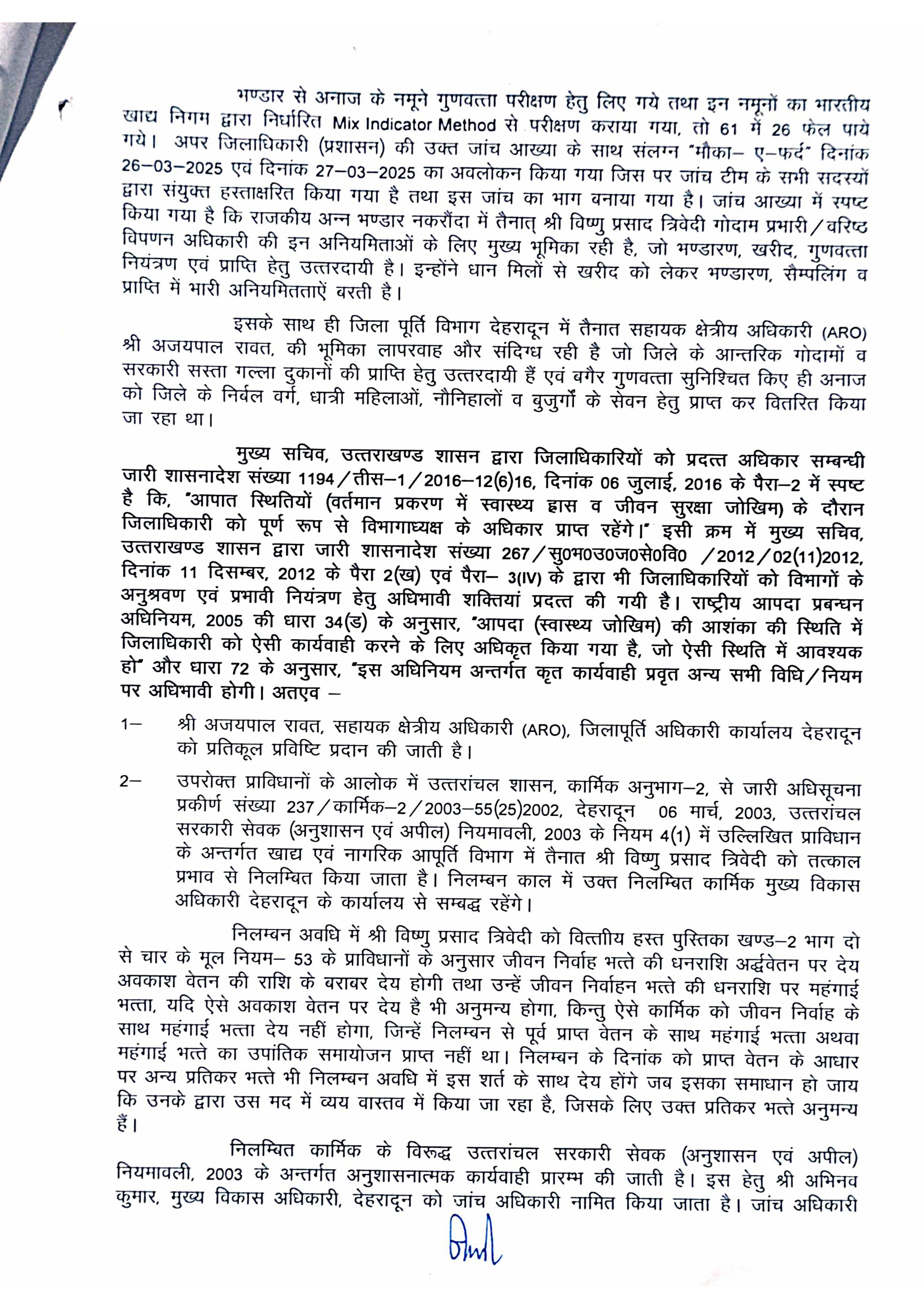 मुख्य विकास अधिकारी को जांच अधिकारी नामित करते हुए सम्बन्धित कार्मिकों के विरूद्ध उत्तरांचल सरकारी सेवक नियमावली-2003 के अन्तर्गत अनुशासनात्मक कार्यवाही प्रारम्भ करते हुए जांच आख्या प्रस्तुत करने के निर्देश दिए गए है। एसएमओ विष्णु प्रसाद त्रिवेदी निलम्बित, एआरओ अजय रावत को प्रतिकूल प्रविष्टि।  निलम्बित कार्मिक मुख्य विकास अधिकारी कार्यालय से सम्बद्ध रहेंगे। विष्णु प्रसाद त्रिवेदी, गोदाम प्रभारी/वरिष्ठ विपणन अधिकारी की इन अनियमितताओं के लिए मुख्य भूमिका रही है, जो भण्डारण, खरीद गुणवत्ता नियंत्रण एवं प्राप्ति हेतु उत्तरदायी मानते हुए उन पर निलम्बन की कार्यवाही की गई है। इसी प्रकार एआरओ अजय रावत की भूमिका लापरवाह एवं संदिग्ध प्रतीत हुई है जो जिले के आन्तरिक गोदामों व सरारी सस्ता गल्ला दुकानों की प्राप्ति हेतु उत्तरदायी हैं एवं बगैर गुणवत्ता सुनिश्चित किए ही अनाज को जिले के निर्बल वर्ग, धात्री महिलाओं, नौनिहालो व बुजुर्गों के सेवन हेतु प्राप्त कर वितरित किया जा रहा है।