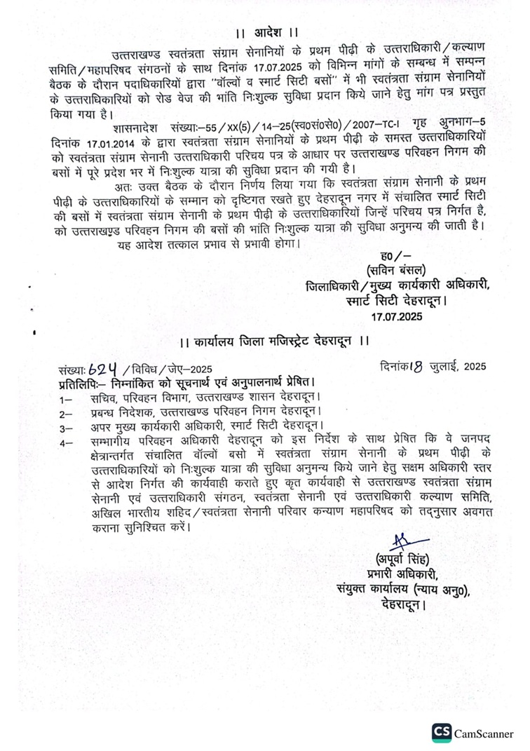 देहरादून : जनमानस से जुड़े मामलों में जिला प्रशासन की संवदेनशीलता बढ गई है। जिलाधिकारी सविन बंसल के निर्देशन में जिला प्रशासन सक्रिय रूप से जनमानस के प्रति अपने दायित्वों का निर्वहन पूर्ण जिम्मेदारी एवं कुशलतापूर्वक कर रहा है। जिलाधिकारी की अध्यक्षता में आयोजित बैठक में स्वतंत्रता संग्राम सेनानियों के उतराधिकारियों ने जिलाधिकारी से रोडवेज व स्मार्ट सिटी की बसों में निःशुल्क यात्रा का अनुरोध किया गया था, जिस पर डीएम ने बैठक के बीच में ही आदेश जारी करते हुए स्वतंत्रता संग्राम सेनानियों के उत्तराधिकारियों को तोहफा दिया। तथा रोडवेज पर फ्री यात्रा के लिए जीएम से पत्राचार करने का आश्वासन दिया है। अब स्वतंत्रता संग्राम सेनानियों के उत्तराधिकारियों के लिए फी यात्रा की सुविधा रहेगी जिससे डीएम के आन द स्पॉट निर्णय पर खुशी जाहिर करते स्वतंत्रता संग्राम सेनानियों के उत्तराधिकारियों ने हुए डीएम का धन्यवाद दिया। अब स्मार्ट सिटी की बसों में स्वतंत्रता संग्राम सेनानियों के उत्तराधिकारियों हेतु फ्री यात्रा का फ्लेक्स भी चस्पा कर दिया गया है।