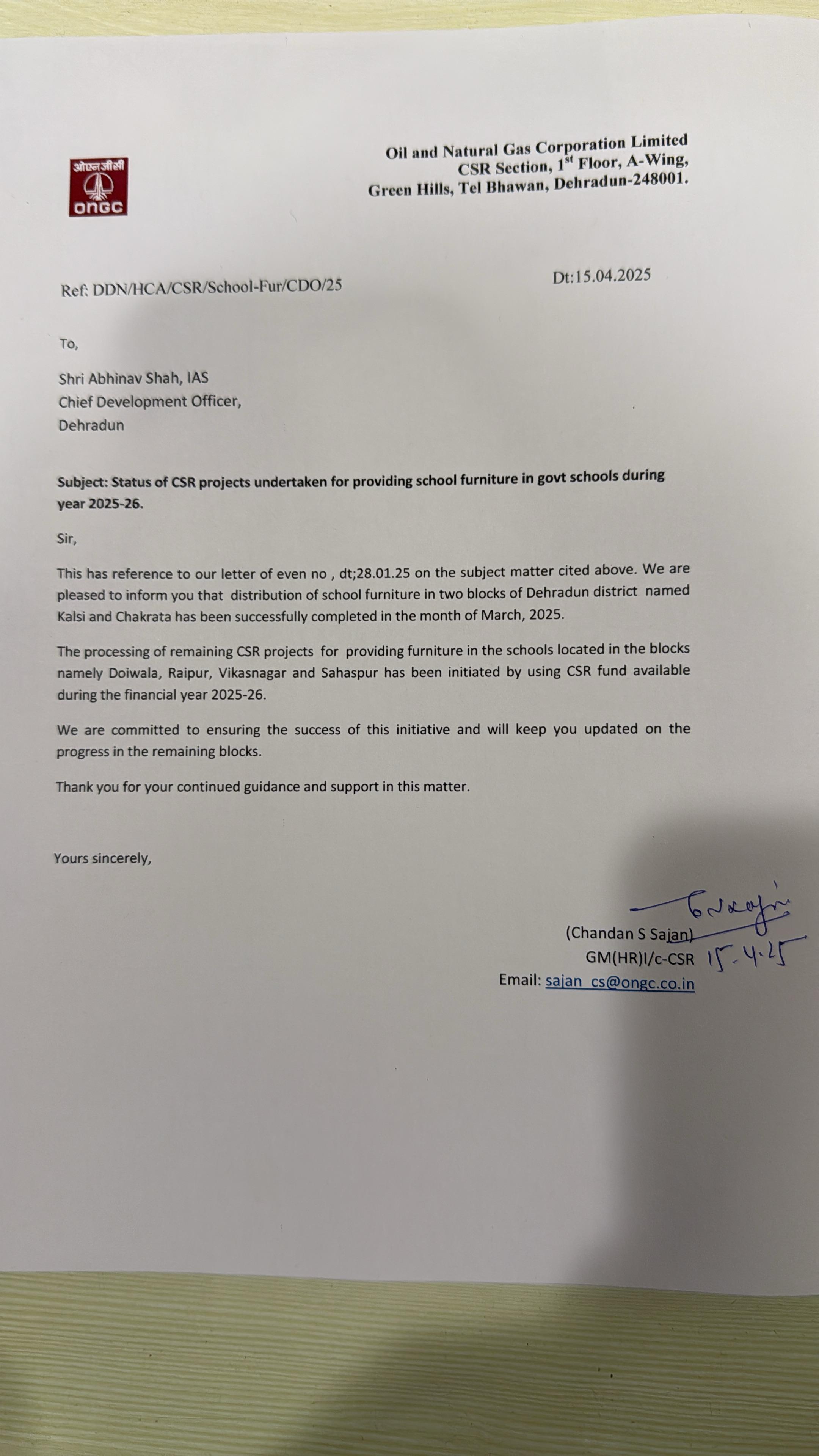 जिलाधिकारी के इस महत्वाकांक्षी प्राजेक्ट में हुडको द्वारा स्कूलों में पठनपाठन व्यवस्था हेतु आधुनिक उपकरण एलईडी के लिए 2.5 के कार्य प्रोसेस में हैं, जबकि ओएनजीसी ने 1.5 करोड़ के फर्नीचर एवं उपकरण में सहयोग कर रही है। ओएनजीसी ने विकासखण्ड चकराता, कालसी स्थत सरकारी स्कूलों को वर्ष 2024-25 में फर्नीचर युक्त कर दिया है तथा वर्ष 2025-26 के लिए विकासखण्ड डोईवाला, रायपुर, विकासनगर व सहसपुर स्थित स्कूलों में फर्नीचर उपलब्ध कराने की प्रक्रिया शुरू कर दी है।