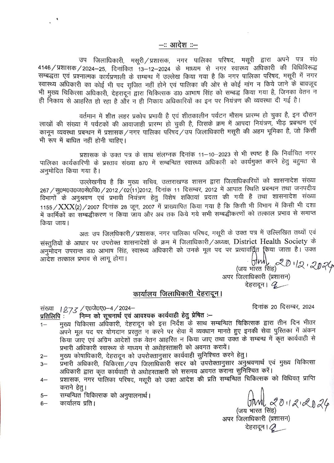 डीएम सविन बंसल का त्वरित सख्त एक्शन लगातार जारी, नगर पालिका परिषद मसूरी में विधि विरूद्ध सम्बद्ध नगर स्वास्थ्य अधिकारी को मूल पद के लिए किया unceremoniously/disgracefully कार्यमुक्त