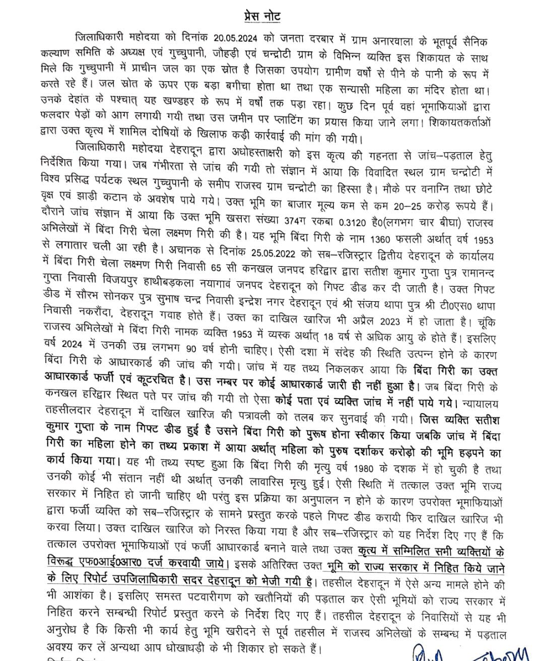 चूंकि राजस्व अभिलेखों मे बिंदा गिरी नामक व्यक्ति 1953 में व्यस्क अर्थात् 18 वर्ष से अधिक आयु के होते हैं। इसलिए वर्ष 2024 में उनकी उम्र लगभग 90 वर्ष होनी चाहिए। ऐसी दशा में संदेह की स्थिति उत्पन्न होने के कारण बिंदा गिरी के आधारकार्ड की जांच की गयी। जांच में यह तथ्य निकलकर आया कि बिंदा गिरी का उक्त आधारकार्ड फर्जी एवं कूटरचित है। उस नम्बर पर कोई आधारकार्ड जारी ही नहीं हुआ है। जब बिंदा गिरी के कनखल हरिद्वार स्थित पते पर जांच की गयी तो ऐसा कोई पता एवं व्यक्ति जांच में नहीं पाये गये। न्यायालय तहसीलदार देहरादून में दाखिल खारिज की पत्रावली को तलब कर सुनवाई की गयी। जिस व्यक्ति सतीश कुमार गुप्ता के नाम गिफ्ट डीड हुई है उसने बिंदा गिरी को पुरूष होना स्वीकार किया जबकि जांच में बिंदा गिरी का महिला होने का तथ्य प्रकाश में आया अर्थात् महिला को पुरुष दर्शाकर करोड़ो की भूमि हड़पने का कार्य किया गया।