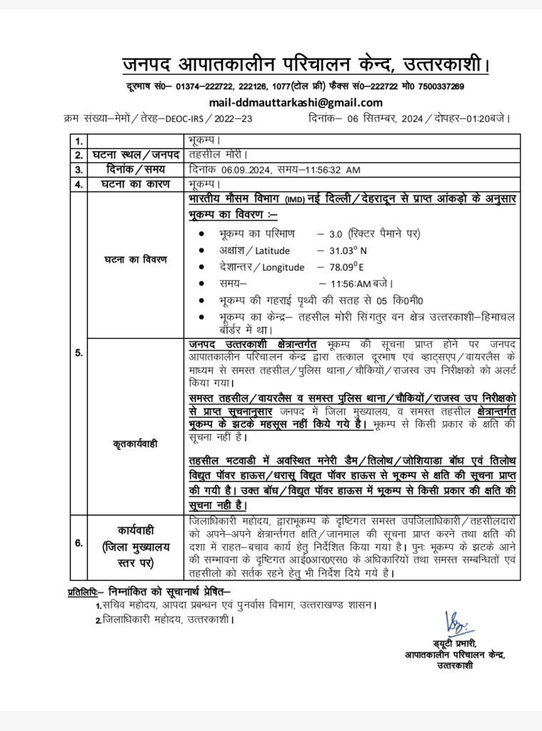 उत्तरकाशी: उत्तरकाशी में एक बार फिर भूकंप के झटके महसूस किए गए। भूकंप का केंद्र बिंदु – सिंगतुर वन क्षेत्र, उत्तरकाशी-हिमाचल बॉर्डर। इस केंद्र पर इसी साल एक बार पहले भी भूकंप के झटके महसूस किए जा चुके हैं।