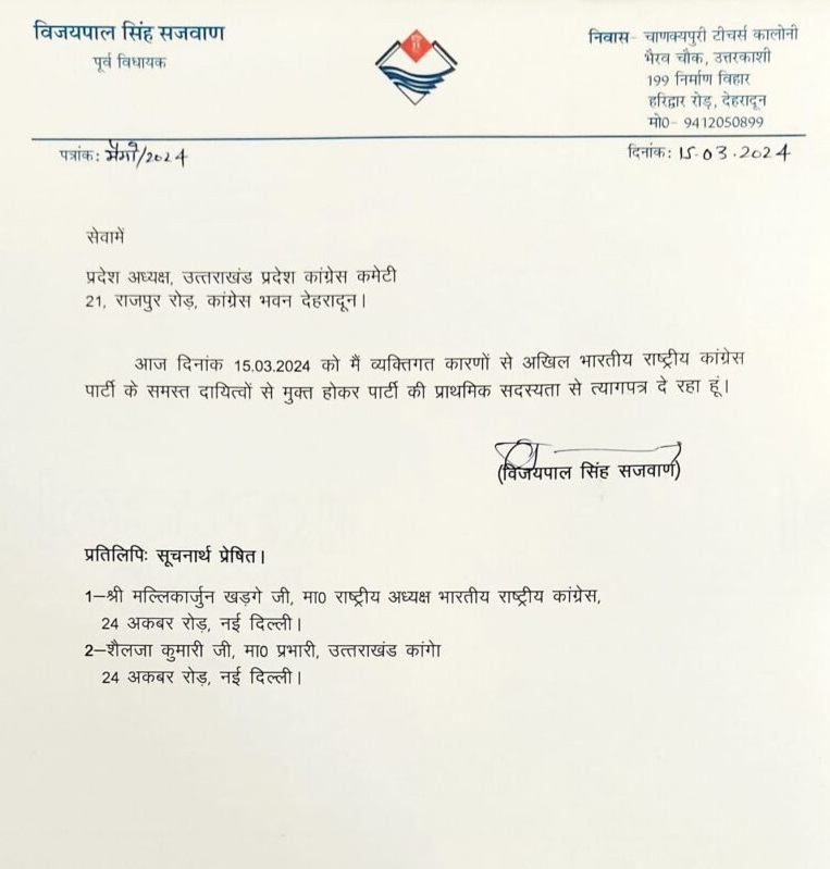 गंगोत्री से पूर्व विधायक विजयपाल सजवाण ने छोड़ी कांग्रेस