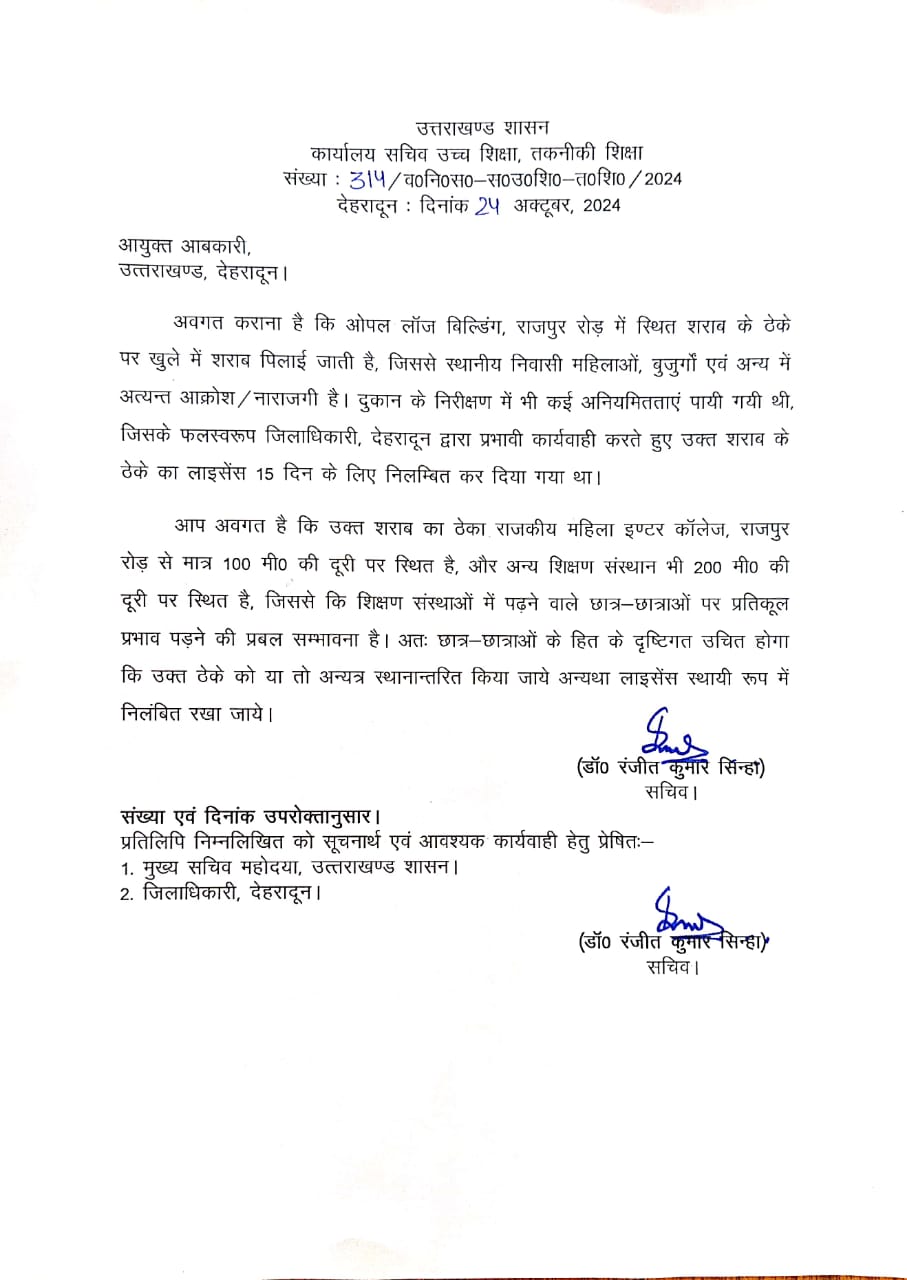 देहरादून : राजपुर रोड स्थित शराब की दुकान को लेकर एक बड़ा आदेश आया हैं जिसमें सचिव उच्च शिक्षा एवं तकनीकी शिक्षा डॉ. रंजीत कुमार सिन्हा ने शराब की दुकान का लाइसेंस स्थायी रूप से निलम्बित रखने के आदेश दिए हैं.