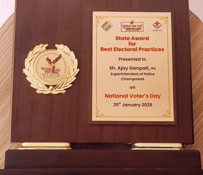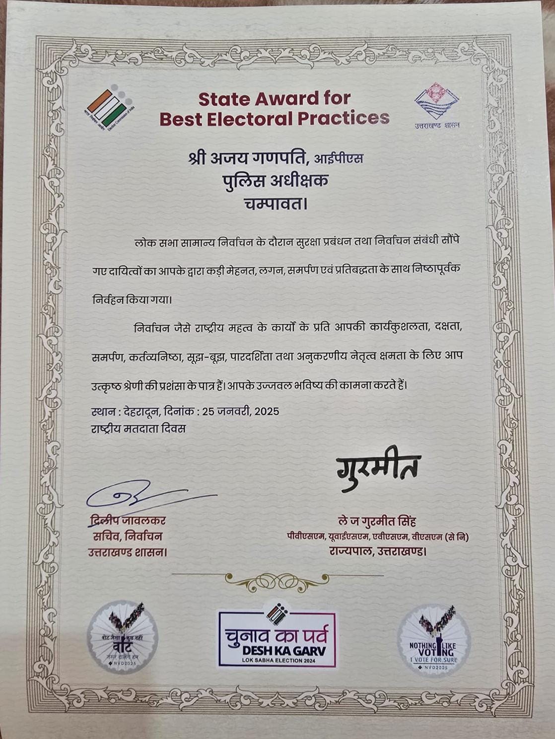 उत्तराखंड के राज्यपाल लेफ्टिनेंट जनरल गुरमीत सिंह द्वारा पुलिस अधीक्षक अजय गणपति के निर्देशन में सकुशल लोकसभा सामान्य निर्वाचन को संपन्न कराए जाने पर पुलिस अधीक्षक महोदय चंपावत की कार्यकुशलता, दक्षता, समर्पण, कर्तव्यनिष्ठा, सूझबूझ, पारदर्शिता तथा अनुकरणीय नेतृत्व क्षमता की सराहना करते हुए State Award for Best Electoral Practices सम्मान से सम्मानित किया गया है।