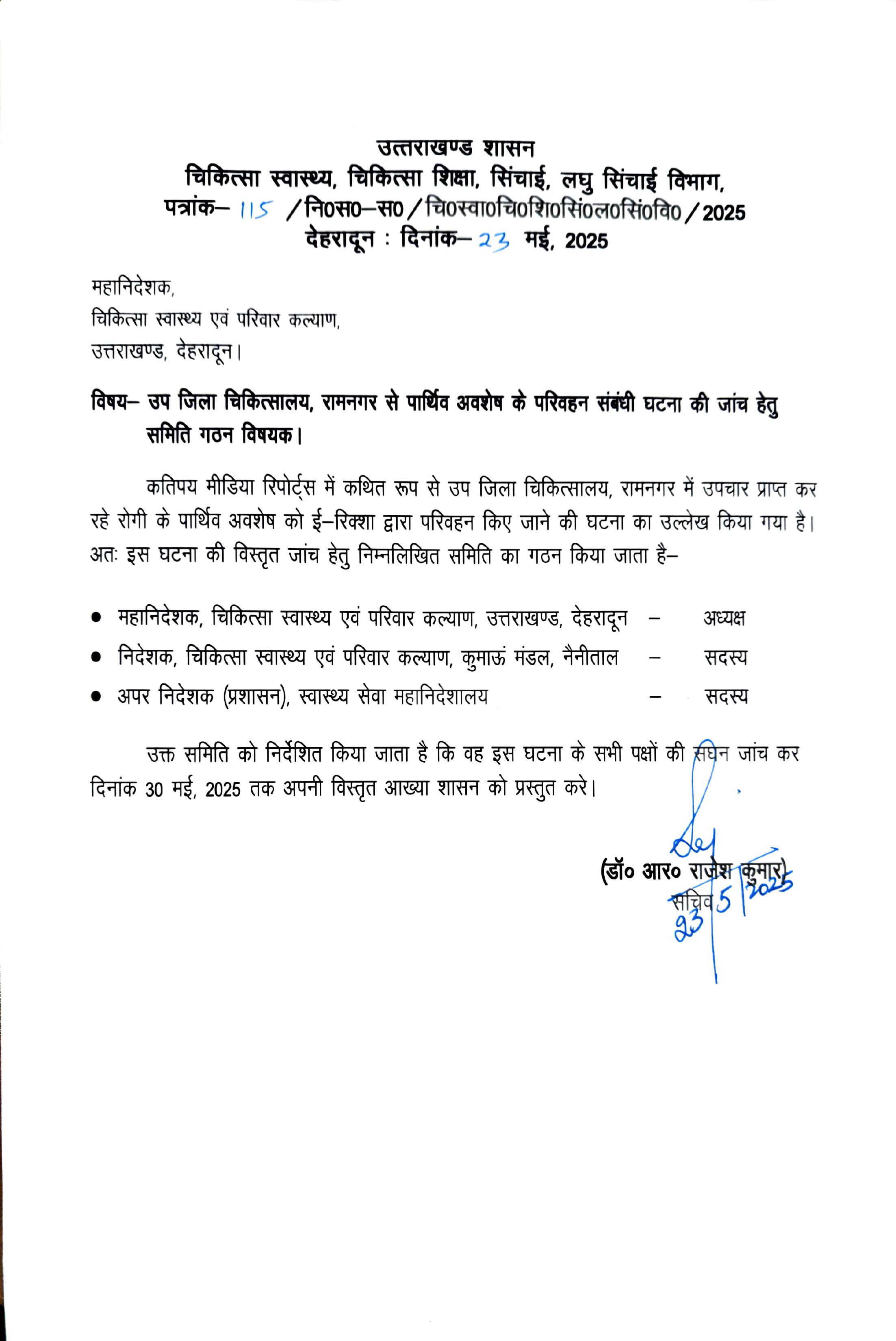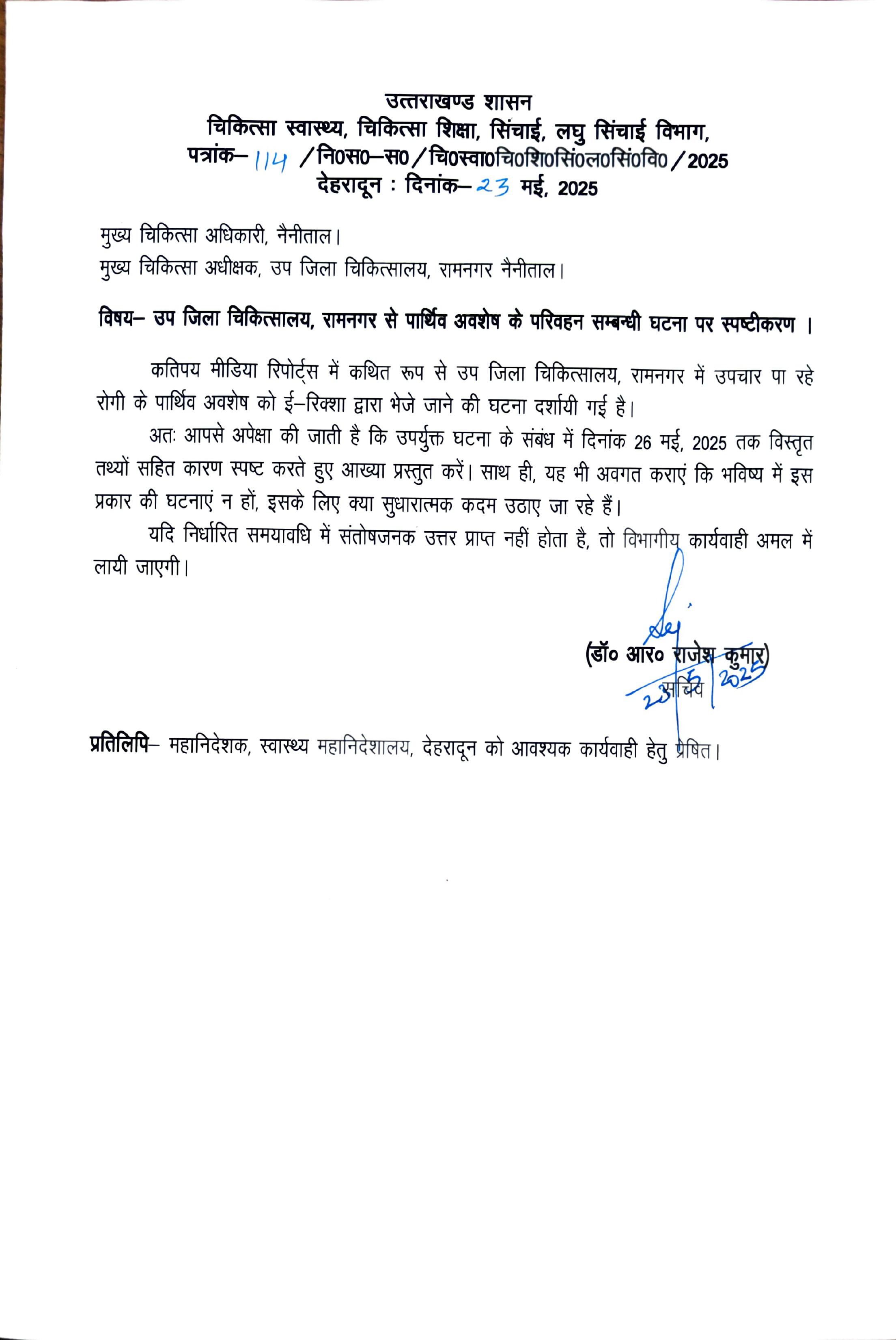 स्वास्थ्य सचिव ने नैनीताल के मुख्य चिकित्सा अधिकारी (CMO) और मुख्य चिकित्सा अधीक्षक, उप जिला चिकित्सालय, रामनगर से भी 26 मई तक विस्तृत आख्या प्रस्तुत करने को कहा है। उन्होंने यह भी स्पष्ट किया कि जांच में यह तथ्य सामने लाया जाए कि उप जिला चिकित्सालय में शव वाहन या एंबुलेंस की सुविधा उपलब्ध क्यों नहीं थी।