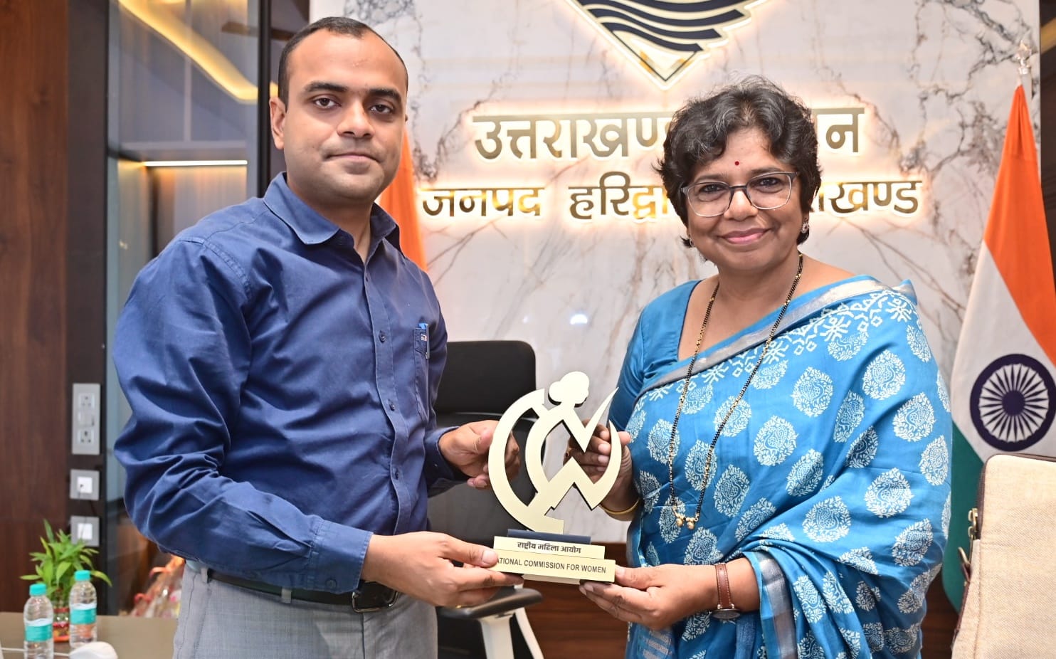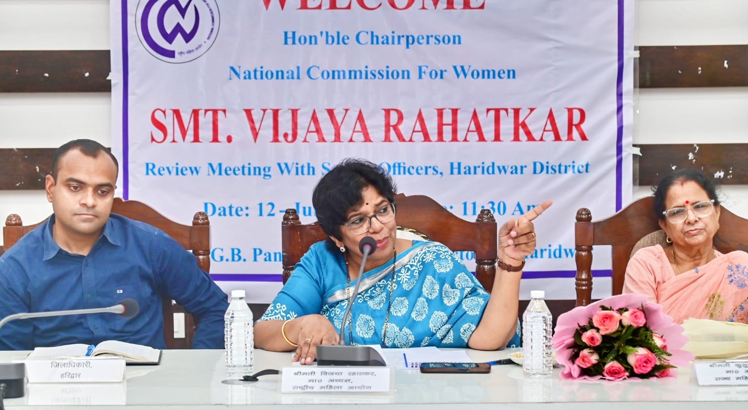 हरिद्वार : जनपद में महिलाओं के उत्थान एवं आत्मनिर्भर बनाने के लिए केंद्र सरकार द्वारा संचालित योजनाओं की कलेक्ट्रेट सभागार में की गई समीक्षा। केंद्र सरकार द्वारा संचालित विभिन्न योजनाओं से लाभान्वित महिलाओं से किया संवाद एवं उनकी समस्याओं को भी सुना। राष्ट्रीय महिला आयोग की अध्यक्ष विजया रहाटकर का जनपद आगमन पर जिलाधिकारी मयूर दीक्षित ने पुष्प गुच्छ भेंटकर किया स्वागत।
