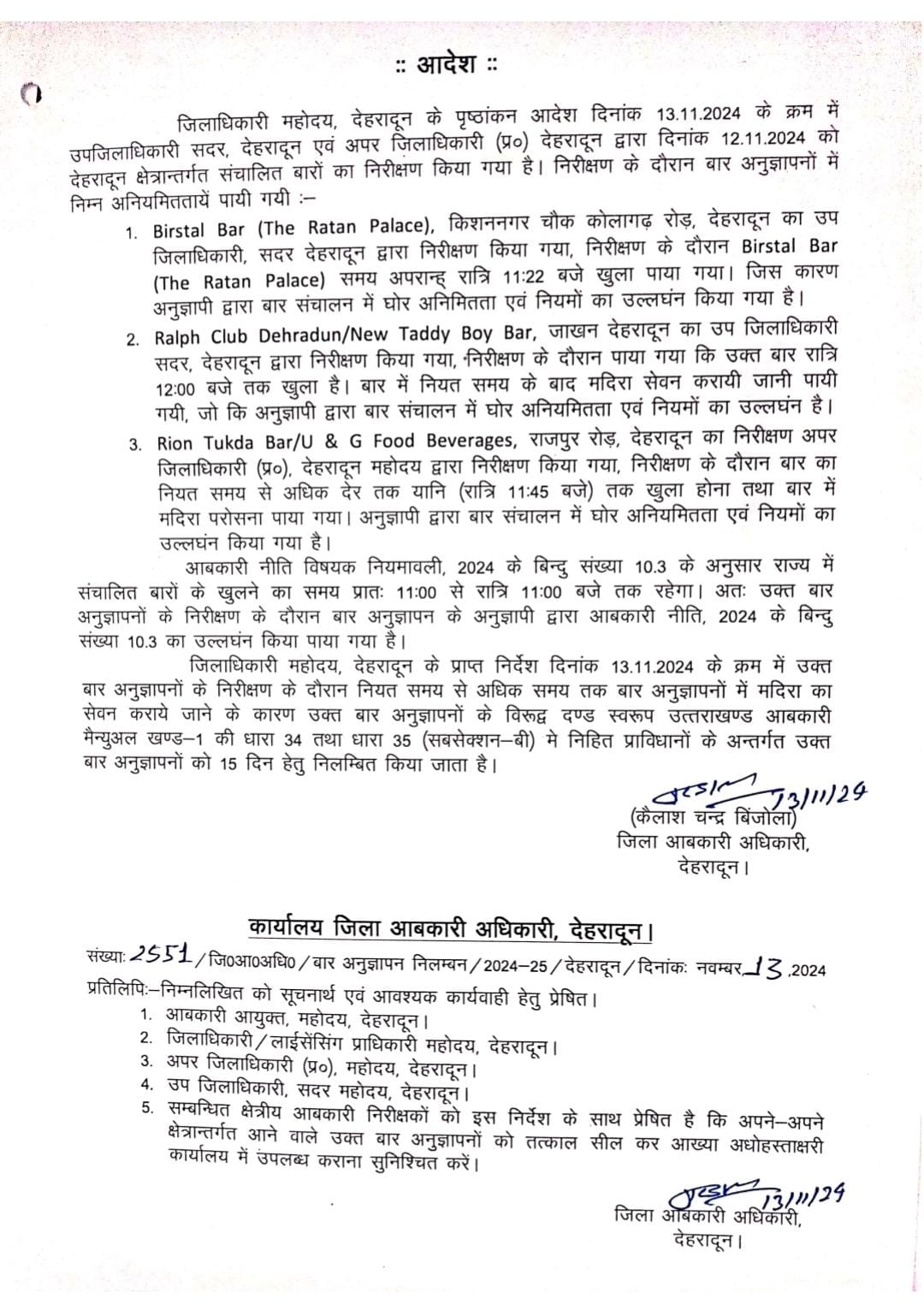 देहरादून : मुख्यमंत्री पुष्कर सिंह धामी के निर्देशों के क्रम में  जिलाधिकारी सविन बसंल ने 05 टीम बनाकर रात्रि में देहरादून क्षेत्रान्तर्गत संचालित कारों बारों के निरीक्षण के दौरान बार एवं पब में मिली अनियमिता पर कार्यवाही के आदेश दिए गए हैं, जिस पर कार्यवाही कर दी गई है। जिलाधिकारी के निर्देश पर अनुज्ञापनों के निरीक्षण के दौरान नियत समय से अधिक समय तक बार अनुज्ञापनों में मदिरा का सेवन कराये जाने के कारण बार अनुज्ञापनों के विरूद्ध दण्ड स्वरूप उत्तराखण्ड आबकारी मैन्युअल खण्ड-1 की धारा 34 तथा धारा 35 (सबसेक्शन-बी) में निहित प्राविधानों के अन्तर्गत उक्त बार अनुज्ञापनों को 15 दिन हेतु निलम्बित किया जाता है।