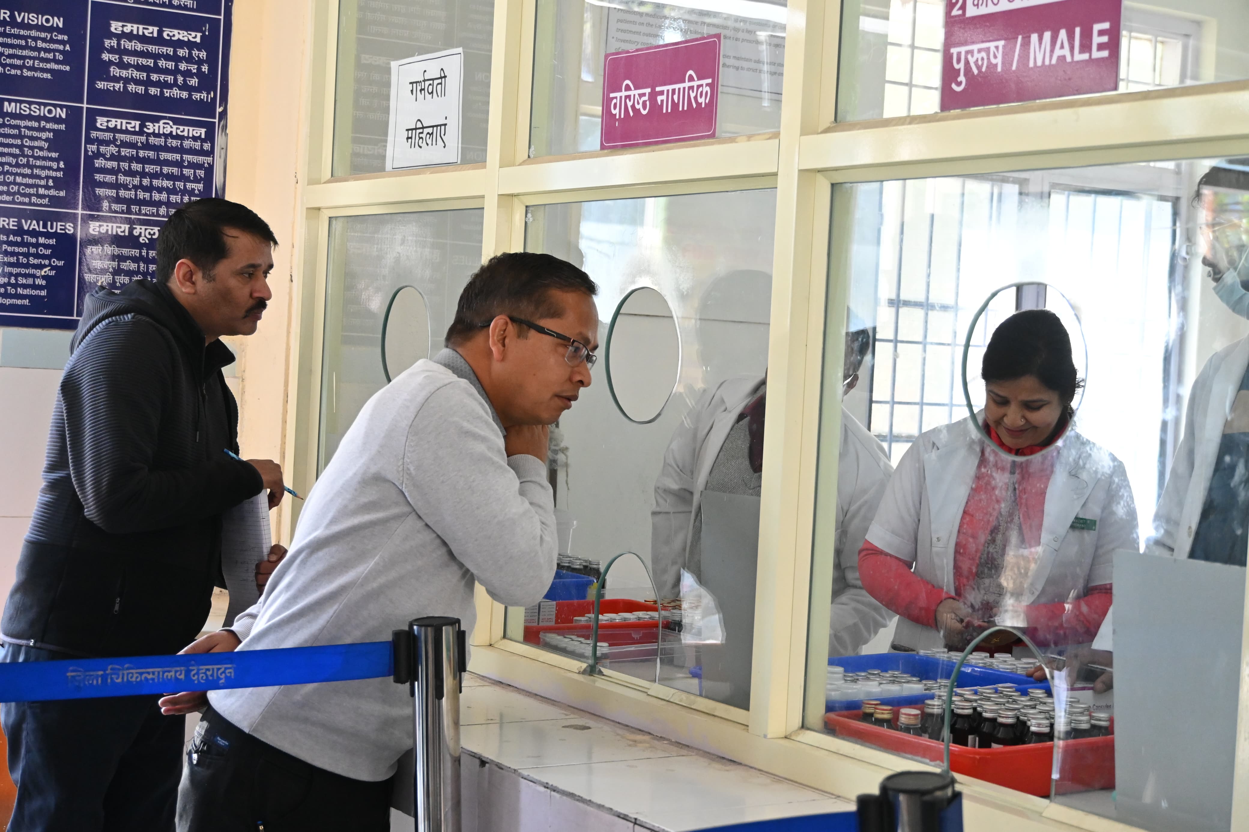 देहरादून : जिलाधिकारी सविन बसंल के निर्देशों के अनुपालन में उप जिलाधिकारी सदर/प्रभारी अधिकारी स्वास्थ्य विभाग हरिगिरि ने आज जिला चिकित्सालय कोरोनेशन का औचक निरीक्षण कर व्यवस्थाओं को देखा। निरीक्षण के दौरान उप जिलाधिकारी ने पंजीकरण कक्ष, वार्ड, दवाई काउंटर, चन्दन लैब कांउटर, आशाघर सहित परिसर का निरीक्षण करते हुए व्यवस्थाएं देखी। उप जिलाधिकारी ने दवाई कांउटर के निरीक्षण के दौरान चिकित्सालय लगने वाली समुचित दवाई की लिस्ट चस्पा करने के निर्देश दिए साथ ही निर्देशित किया कि जो दवाई उपलब्ध हैं व नही हैं के स्टाॅक के सम्बन्ध में विवरण तलब किया। उन्होंने पंजीकरण कक्ष में उपस्थित कार्मिको की संख्या एवं उपस्थिति की जानकारी प्राप्त की वहीं डय्टी में उपस्थित महिला/पुरूष जवानों को सुरक्षा व्यवस्था के साथ ही कांउटर पर लगे लोगों की सहायता करते हुए व्यवस्थित रूप से कतार लगाने में सहयोग के निर्देश दिए।