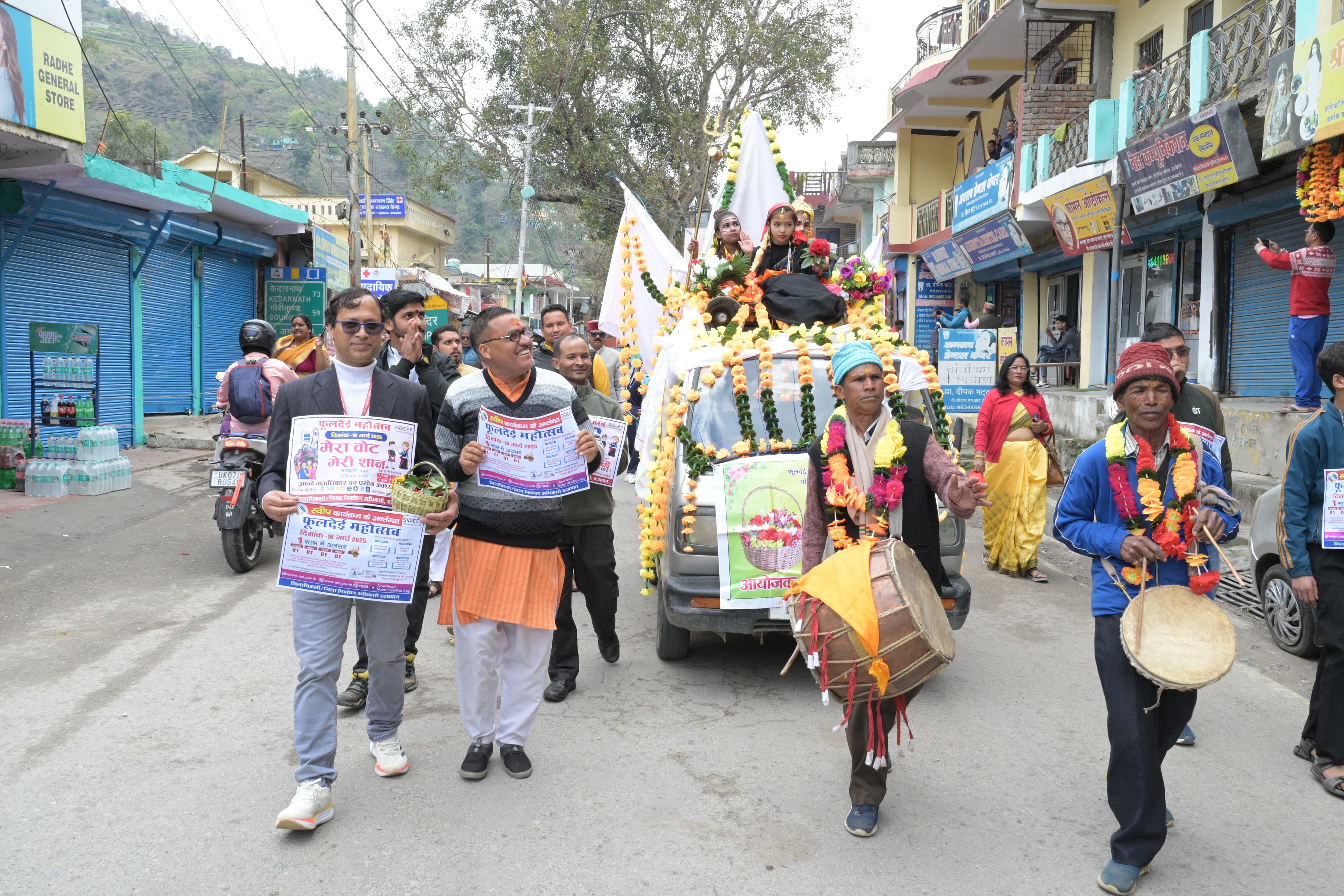 रुद्रप्रयाग : जिलाधिकारी/जिला निर्वाचन अधिकारी सौरभ गहरवार के निर्देशन में अगस्त्यमुनि स्पोर्ट्स मैदान में आज स्वीप (SVEEP) और दस्तक पहाड़ के तत्वावधान में फूलदेई महोत्सव का भव्य आयोजन किया गया। इस दौरान जनपद के विभिन्न स्कूलों के छात्र-छात्राओं द्वारा अगस्त्यमुनि के मुख्य बाजार में घोघा माता की डोली यात्रा निकाली गई, जिसमें बच्चों ने पारंपरिक परिधानों में उत्साहपूर्वक भाग लिया।कार्यक्रम के दौरान स्वीप टीम ने उपस्थित लोगों को मतदान की महत्ता के बारे में जागरूक करते हुए आगामी पंचायत चुनाव में अधिक से अधिक मतदान करने के लिए प्रेरित किया। उन्होंने बताया कि लोकतंत्र को मजबूत बनाने के लिए हर मतदाता की भागीदारी आवश्यक है।