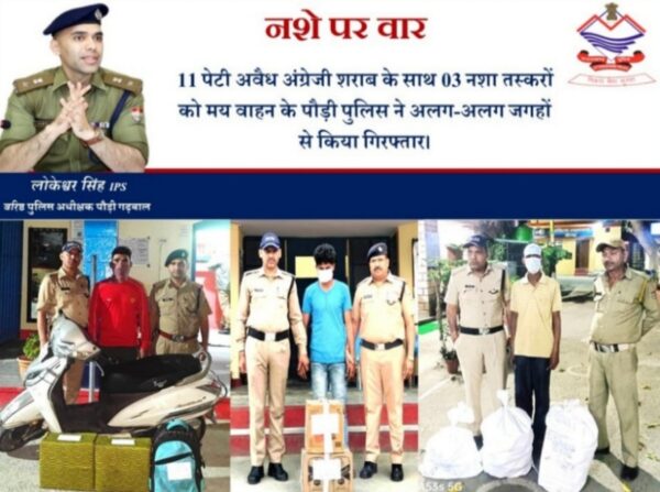 कोटद्वार। वर्ष 2025 तक उत्तराखण्ड को नशामुक्त बनाये जाने हेतु चलाये जा रहे अभियान के तहत वरिष्ठ पुलिस अधीक्षक पौड़ी लोकेश्वर सिंह के निर्देशन में बढते नशे की प्रवृत्ति पर अंकुश लगाने के निर्देश पर कोतवाली पौड़ी पुलिस ने चैकिंग के दौरान ग्राम खूनीबड़, कोटद्वार निवासी अभियुक्त नितिन कुमार थपलियाल को पाटीसैण क्षेत्र से स्कूटी में 3 पेटी अवैध अंग्रेजी शराब का परिवहन करते हुये मय स्कूटी के गिरफ्तार किया। थाना सतपुली पुलिस टीम ने भी चैकिंग के दौरान ग्राम चौपड़ा, पो0 बाडयू, निवासी अंकित सिंह नेगी को एक वाहन में 2 पेटी अवैध अंग्रेजी शराब ले जाते हुए गिरफ्तार किया वहीं कोतवाली कोटद्वार पुलिस ने चैकिंग के दौरान पदमपुर, कोटद्वार निवासी राकेश को गुलर पुल के पास से 6 पेटी अवैध अंग्रेजी शराब के साथ गिरफ्तार किया। तीनों अभियुक्तों के विरूद्ध सम्बन्धित थानों में आबकरी अधिनियम के तहत अलग-अलग अभियोग पंजीकृत किए गए ।