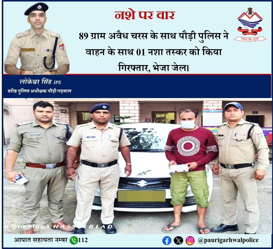 कोटद्वार । मुख्यमंत्री उत्तराखंड ने वर्ष-2025 तक उत्तराखण्ड को नशामुक्त बनाए जाने हेतु चलाये जा रहे अभियान के क्रम में वरिष्ठ पुलिस अधीक्षक पौड़ी लोकेश्वर सिंह के निर्देशन में बढते नशे की प्रवृत्ति पर अंकुश लगाने तथा आगामी लोकसभा चुनाव में नशा तस्करी की रोकथाम के लिए पौड़ी पुलिस द्वारा नशा तस्करों पर लगातार शिकंजा कसा जा रहा है, नशा तस्करों के विरुद्ध लगातार अभियान चलाकर उनके विरुद्ध कड़ी से कड़ी कार्यवाही की जा रही है, जिसके क्रम में कोतवाली कोटद्वार पुलिस ने चैकिंग के दौरान मनोज सिंह भण्डारी पुत्र प्रकाश सिंह भण्डारी, निवासी ग्राम सुराड़ी, पो0-चैलूसैण, तहसील लैन्सडाउन, जनपद पौड़ी गढ़वाल को पनियाली गेस्ट हाउस कोटद्वार के पास से वाहन संख्या UK 15TA 0689, स्विफ्ट कार में 89 ग्राम अवैध चरस का परिवहन करते हुए गिरफ्तार किया गया। जिस सम्बन्ध में वाहन को सीज करते हुये अभियुक्त के विरूद्ध कोतवाली कोटद्वार में एनडीपीएस के तहत अभियोग पंजीकृत किया गया। अभियुक्त को माननीय न्यायालय के समक्ष पेश कर न्यायिक हिरासत में जेल भेज दिया गया है।