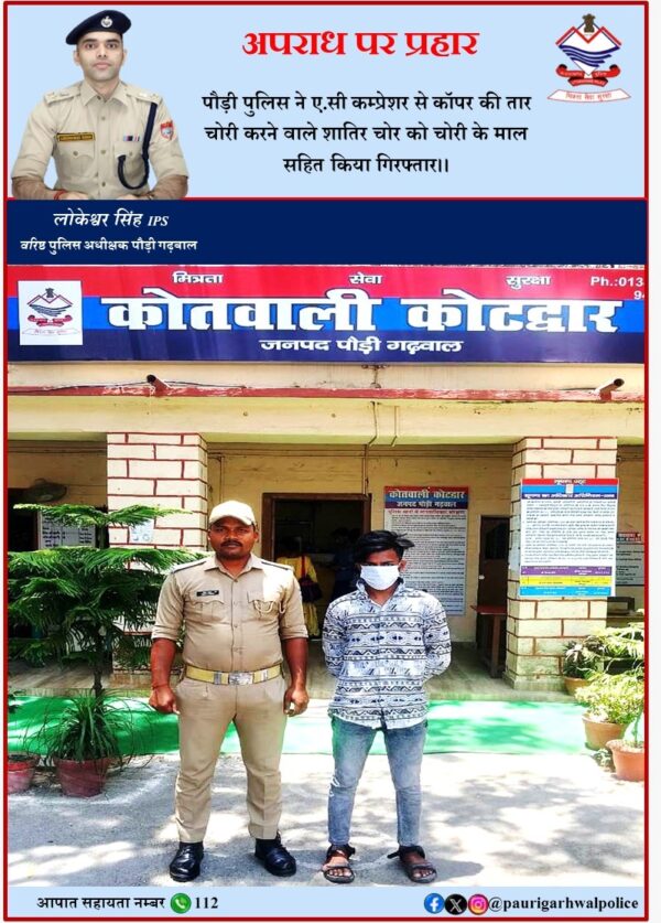 कोटद्वार। एआईए सिक्योरिटी ब्रांच आफिस देवी रोड़ कोटद्वार निवासी पिंटू कुमार ने कोतवाली कोटद्वार में दर्ज कराई गई रिपोर्ट में बताया कि किसी अज्ञात व्यक्ति ने उसके आफिस टाटा एआईए लाइफ इन्शयोरेन्स निकट देववाणी होटल, देवी रोड़ कोटद्वार में लगे एसी कम्प्रेशर के पाइपों से कॉपर की तार चोरी व क्षतिग्रस्त कर दी है। वरिष्ठ पुलिस अधीक्षक लोकेश्वर सिंह ने चोरी की उक्त घटना का शीघ्र खुलासा करने के निर्देश पर कोतवाली प्रभारी निरीक्षक मणिभूषण श्रीवास्तव के नेतृत्व में गठित पुलिस टीम ने सीसीटीवी कैमरों की मदद से अभियोग में संलिप्त झूलापुल स्कूल नम्बर 3, लकड़ी पड़ाव कोटद्वार निवासी 19 वर्षीय फारूख पुत्र स्व0 शरीफ जमील को दिल्ली फार्म रोड़ कोटद्वार के पास से तीन किलो चोरी किए गए तांबे के तार के साथ गिरफ्तार किया गया। पुलिस टीम में वरिष्ठ उपनिरीक्षक जयपाल सिंह चौहान, उपनिरीक्षक मेहराजुद्दीन, मुख्य आरक्षी हेमन्त कुमार, सुनील मलिक व आरक्षी चन्द्रपाल शामिल थे।