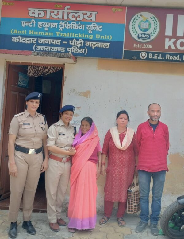 कोटद्वार। वरिष्ठ पुलिस अधीक्षक पौड़ी लोकेश्वर सिंह ने जनपद की एएचटीयू टीम को गुमशुदाओं को सकुशल बरामद कर परिजनों के सुपुर्द करने के आदेश दिए जाने पर एंटी ह्यूमन ट्रैफिकिंग यूनिट कोटद्वार को सहारनपुर से पंजाब नेशनल बैंक के मैनेजर मनमोहन सिंह ने सोशल मीडिया के माध्यम से एक बुजुर्ग माता का वीडियो भेजा गया। वीडियो में माताजी को बुआखाल जनपद पौड़ी की निवासी बताया गया। उक्त वीडियो का ऑपरेशन स्माइल टीम ने तत्काल संज्ञान लेकर उक्त गुमशुदा बुजुर्ग माताजी के सम्बन्ध में जानकारी की गई तो माता का नाम राधा देवी पत्नी स्वर्गीय गोविंद सिंह, उम्र 75 वर्ष, निवासी सतपाल धर्मशाला वार्ड नंबर 9 श्रीनगर रोड़, जनपद पौड़ी गढ़वाल होना पाया गया।
