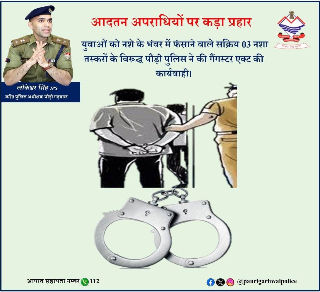 कोटद्वार । वरिष्ठ पुलिस अधीक्षक पौड़ी लोकेश्वर सिंह ने आगामी लोकसभा चुनाव को देखते हुए जनपद में सभी थाना प्रभारियों को आपराधिक गतिविधियों की रोकथाम और आदतन अपराधियों की निगरानी करने तथा भविष्य में आपराधिक गतिविधियों पर अंकुश लगाए जाने के निर्देश दिए हैं । जिसके तहत प्रभारी निरीक्षक मणीभूषण श्रीवास्तव के नेतृत्व में कोतवाली कोटद्वार पुलिस ने तीन अभियुक्तों झूलापुल बस्ती निवासी बंटी चन्द्रा पुत्र सोनू चन्द्रा व साक्षी पुत्री पप्पू एवं ग्रांसटन गंज निवासी उमेश रावत पुत्र धीरेन्द्र सिंह रावत के विरूद्ध गैंगस्टर एक्ट के तहत कार्यवाही की गई। तीनों अभियुक्त लगातार कोटद्वार के आसपास के क्षेत्रों में नशा तस्करी में सक्रिय थे। ये लोग बरेली से स्मैक को कम दामों पर लाकर युवाओं को यहां ऊँचे दामों में बेचने का काम करते हैं।