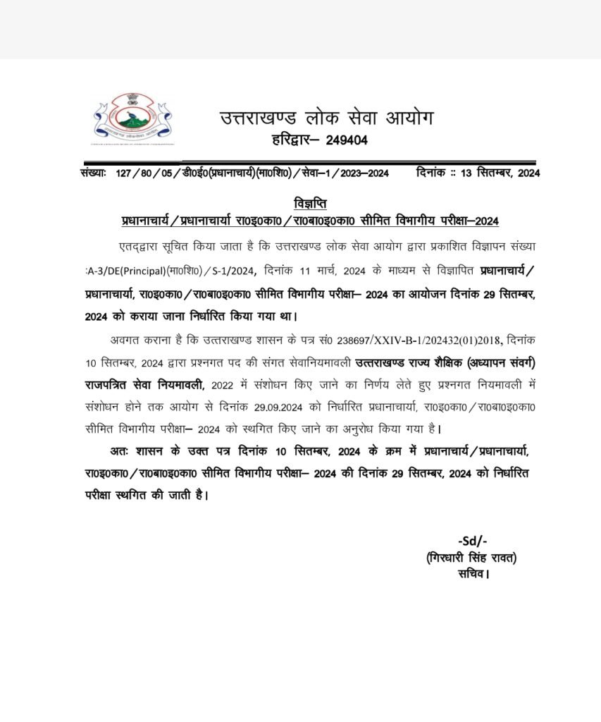 Home » Blog » उत्तराखंड में प्रधानाचार्य सीधी भर्ती स्थगित, UKPSC ने जारी किया नोटिफिकेशन